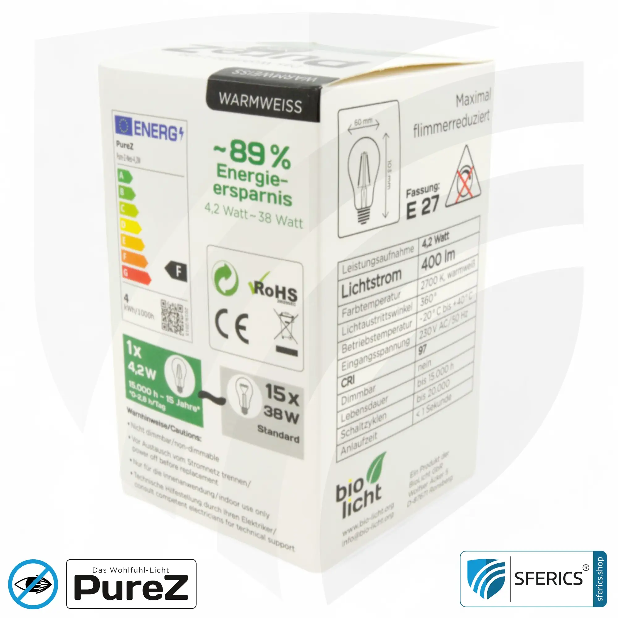 - 4,2 Watt (entspricht der Lichtleistung einer 60 Watt Glühbirne)