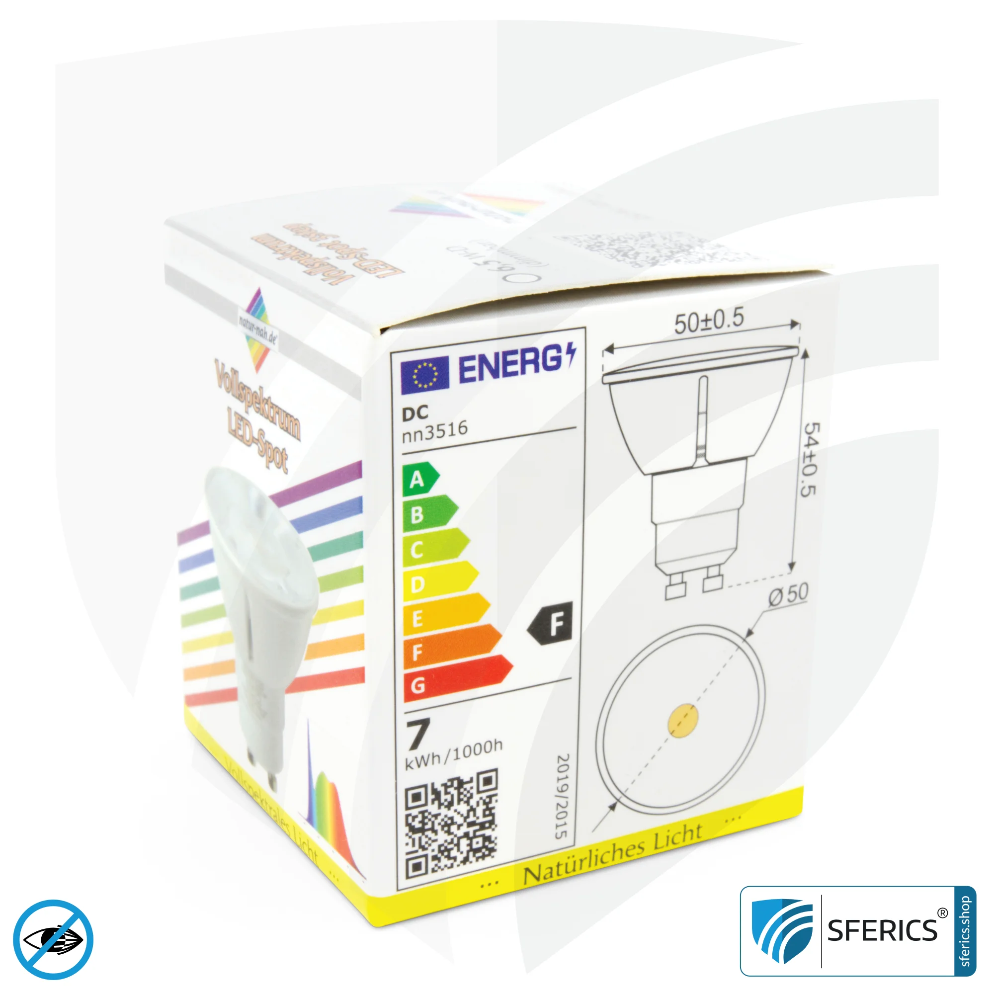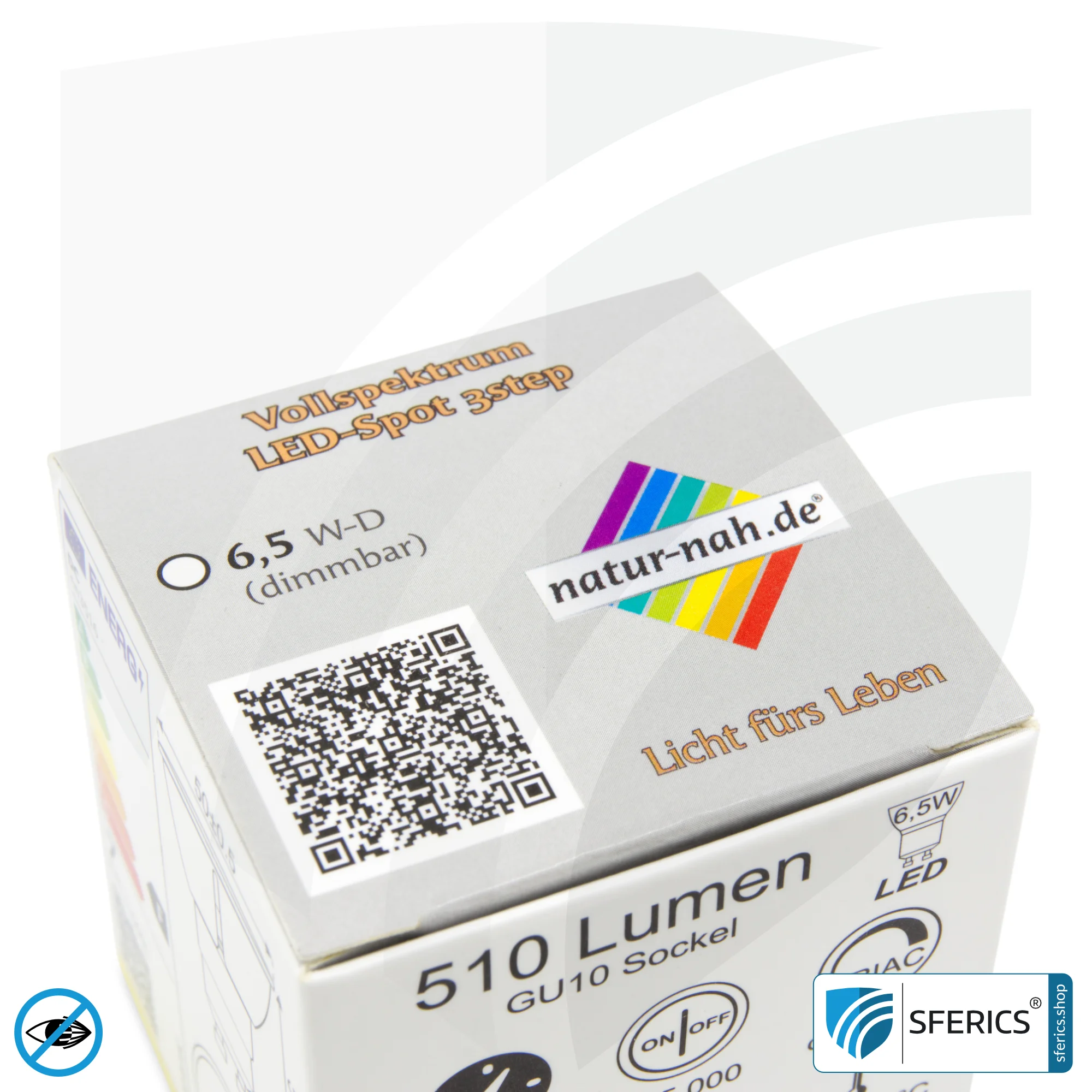 6,5 Watt LED Spot Vollspektrum 3step mit GU10 Sockel. Ein naturnahes Tageslicht mit einer Farbwiedergabe CRI >93 und nahezu “flimmerfrei”. Dimmbar mit kompatiblem LED Dimmer. Für Dauerbetrieb geeignet.