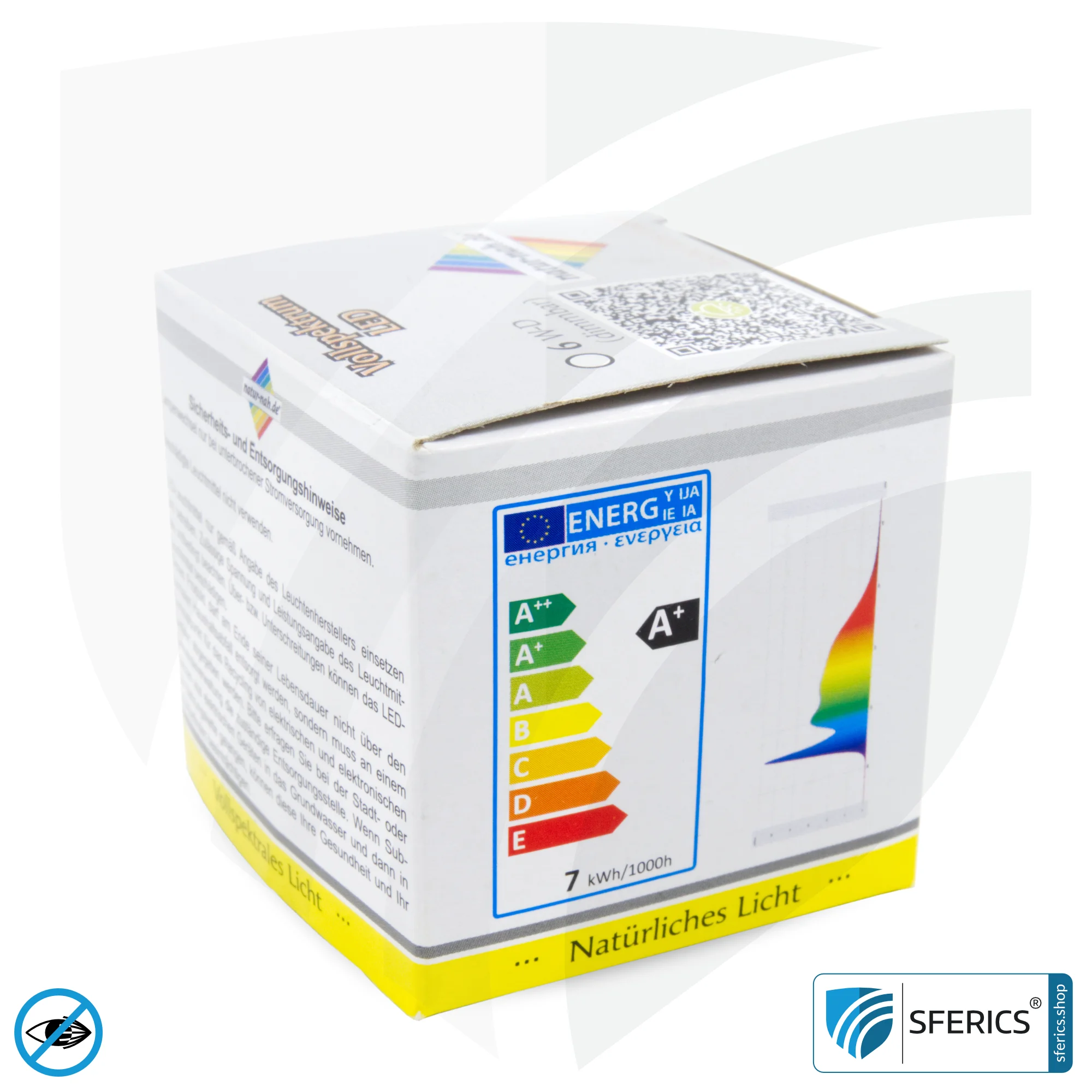 Dieser Hightech LED Strahler mit 6 Watt besticht neben der Lichtqualität mit sehr hoher Farbwiedergabe. So liegt der Farbwiedergabeindex CRI bei unglaublichen 95 dh. mit dieser Vollspektrum LED-Lampe kann maximal sonnennahes Vollspektrumlicht genossen werden. In Bezug auf Farben bedeutet dies: Farben natürlich sehen, Farben natürlich erkennen und Farben natürlich vergleichen, allerdings auch weniger müde sein und sich besser konzentrieren können.