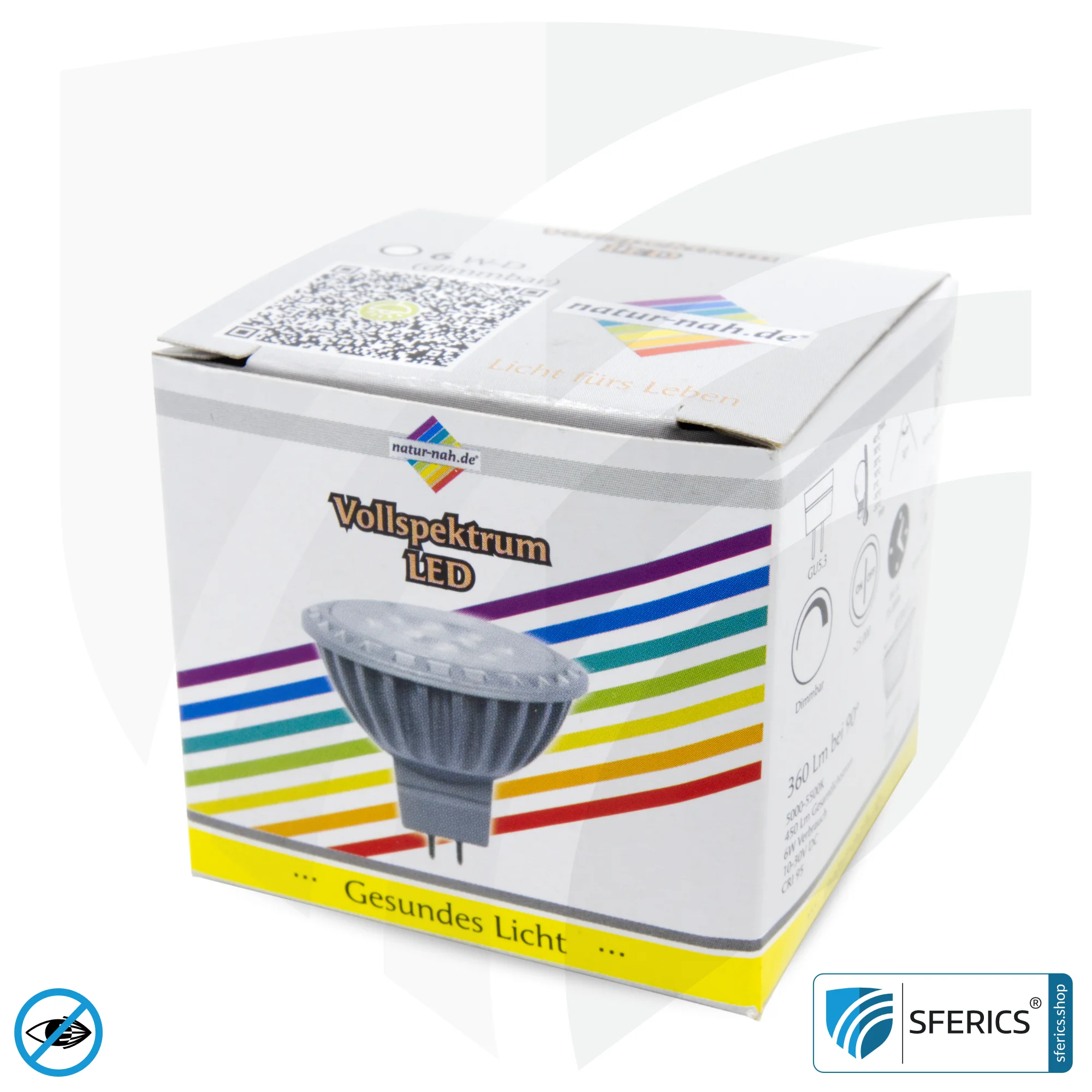 6 Watt LED Spot Vollspektrum mit GU5.3 Sockel. Ein naturnahes Tageslicht mit einer hoher Farbwiedergabe CRI 95 und nahezu “flimmerfrei”. Dimmbar. Für Dauerbetrieb geeignet.