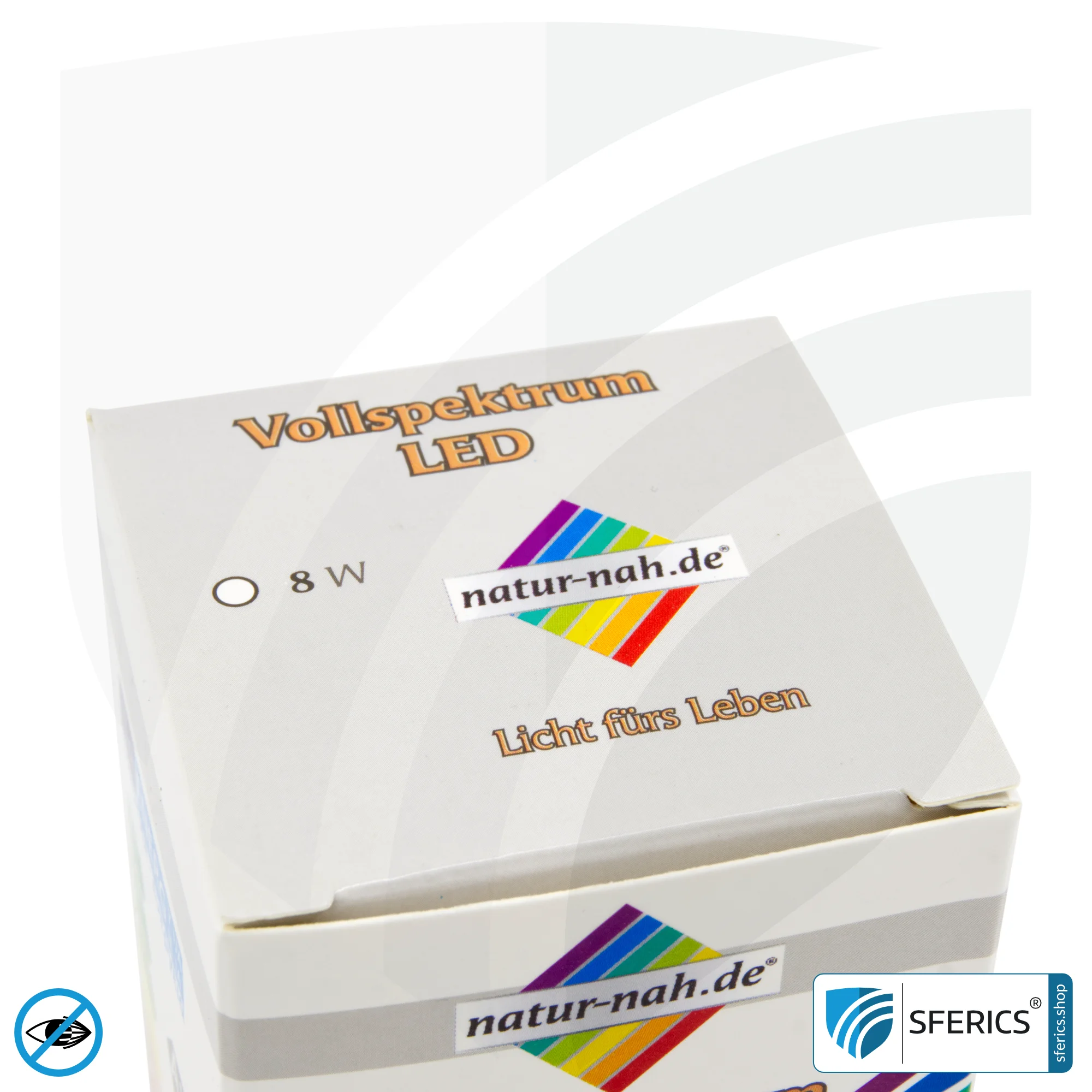 8 Watt LED Vollspektrum mit E27 Sockel. Ein naturnahes Tageslicht mit einer hoher Farbwiedergabe CRI 95 und nahezu “flimmerfrei”. Für Dauerbetrieb geeignet. Nicht dimmbar.