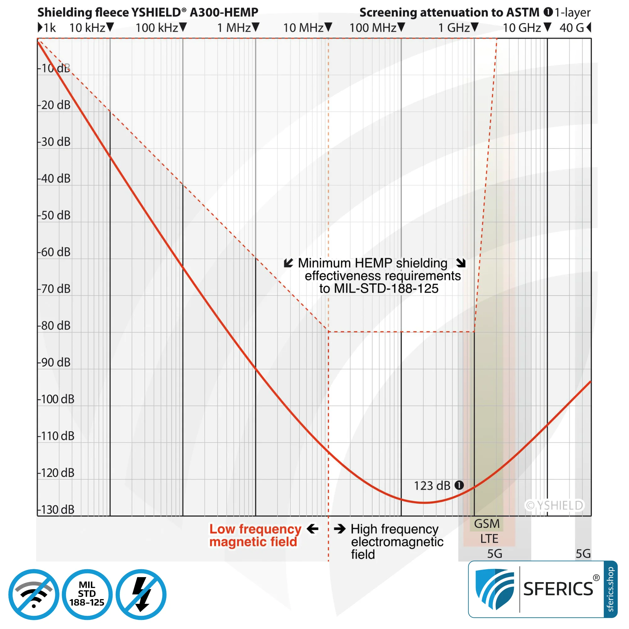 Die Konformität dieses Produkt mit MIL-STD-188-125 wurde von dem akkreditierten Labor EMCC DR. RASEK geprüft. Dieses Produkt erfüllt die Mindestabschirmung magnetischer Felder von 10 kHz bis 10 MHz und hochfrequenter Felder von 10 MHz bis 1 GHz. Darüber hinaus wurden die hochfrequenten Felder von 1 GHz bis 40 GHz nach ASTM D4935-10 ermittelt.