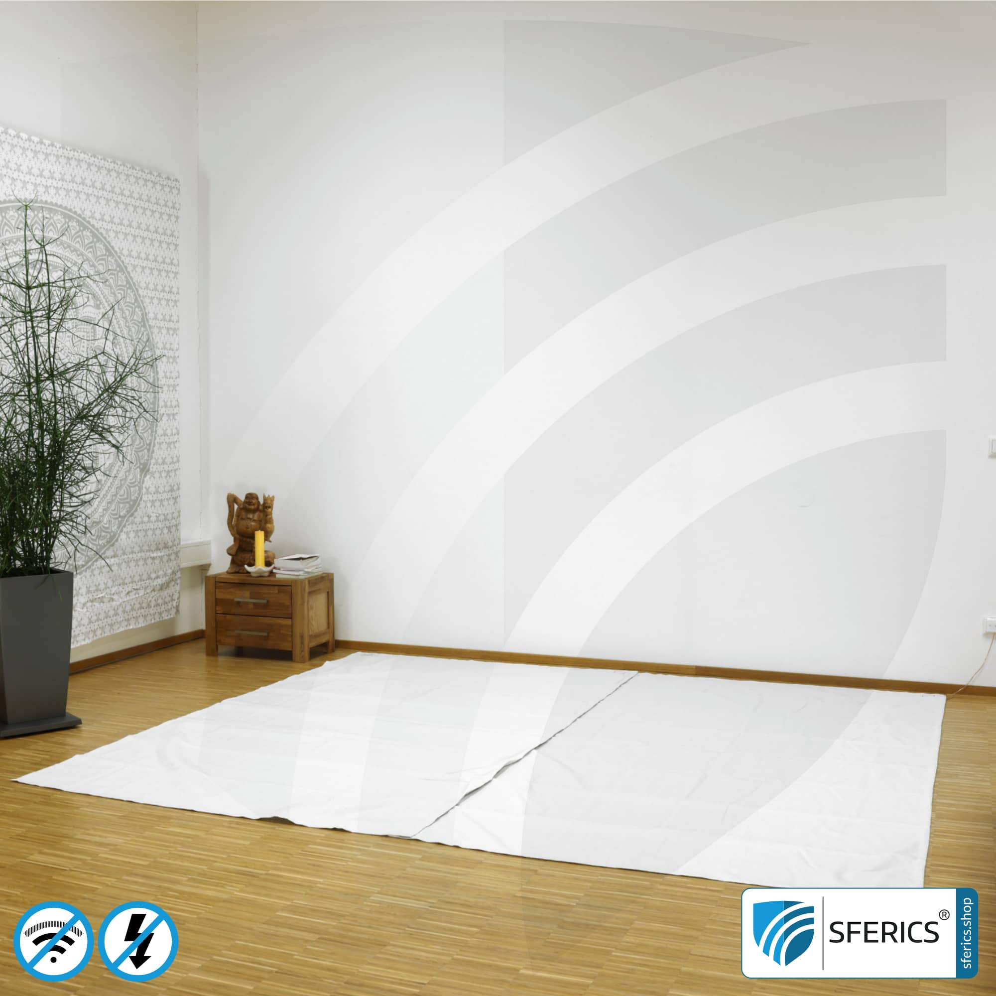 Unsere Bodenunterlage ist unempflindlich gegenüber mechanischem Druck d.h. darauf laufen oder ein Bett drauf zu stellen ist ohne weiteres möglich. Weiters sind die im Abschirmstoff verwobenen Edelstahlfäden nicht isoliert und damit elektrisch kontaktierbar. Dadurch ist diese Bodenunterlage erdbar und kann sobald geerdet elektrische Felder von Boden verlegten Leitungen oder der Deckenbeleuchtung der Wohnung unter dem Schlafzimmer abschirmen.