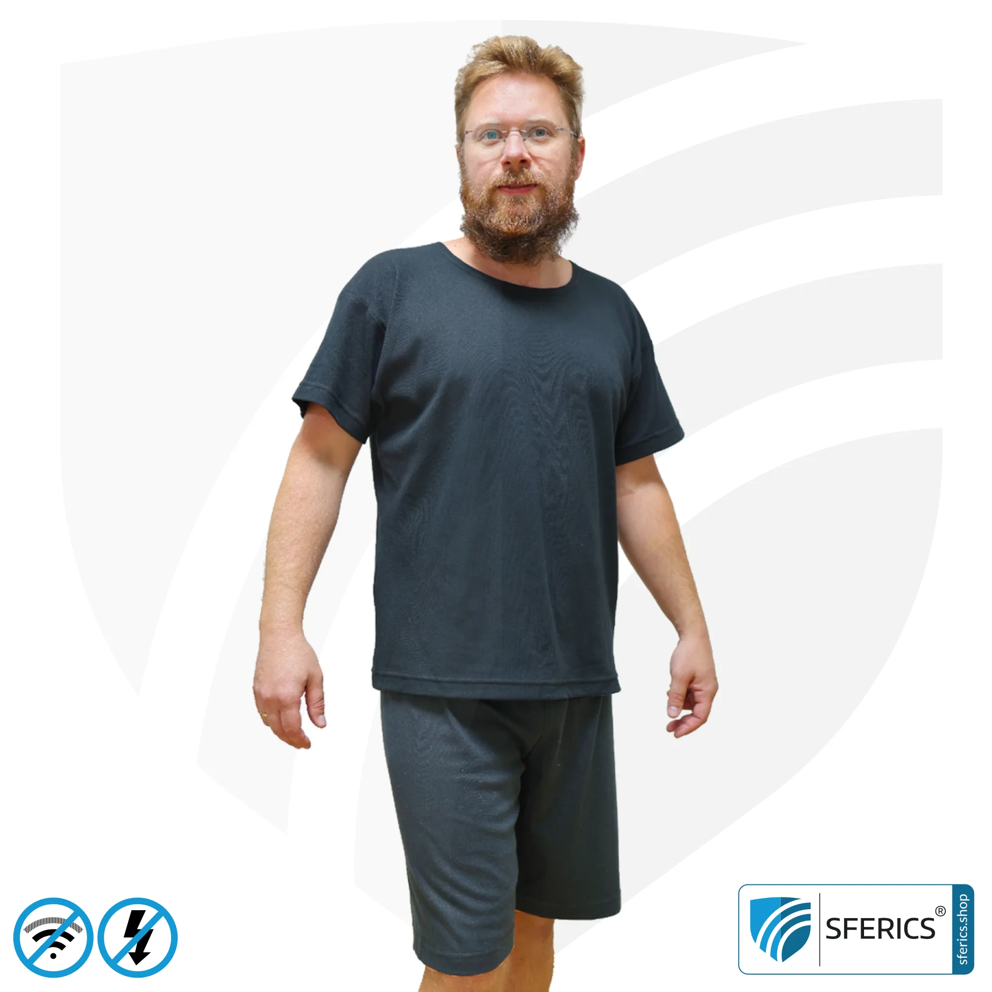 Das T-Shirt schützt bereits wirkungsvoll vor ElektrosmogElektrosmog ist ein umgangssprachlicher Ausdruck für die Gesamtheit an Immissionen von elektrischen, magnetischen und elektromagnetischen Feldern. » Mehr Info HF, dennoch ist es einfach ideal in Kombination mit unseren abschirmenden Shorts aus dem gleichen Abschirmstoff. Jedes abschirmende T-Shirt wird mit großer Sorgfalt von Hand in Deutschland hergestellt und ist keine Massenprodukte von der Stange. Die hohe Leistungsfähigkeit vom Black-Jersey Abschirmstoff macht dieses dezente Kleidungsstück zum idealen Begleiter, zu Hause, im Urlaub oder auf Geschäftsreisen.