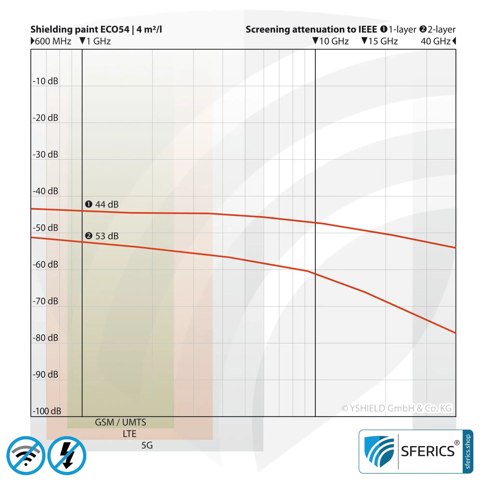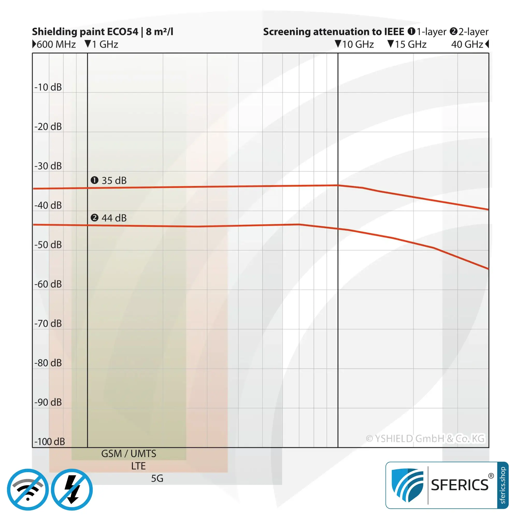 Die Abschirmfarbe ECO54 ist eine abschirmende Spezialfarbe ohne Konservierungsmittel. Eine neue Rezeptur mit höchstem ökologischem Anspruch, ideal für Allergiker. Sie bietet bis zu 75 dB Schirmdämpfung bei 40 GHz (eine Abschirmwirkung von über 99,999999 %).