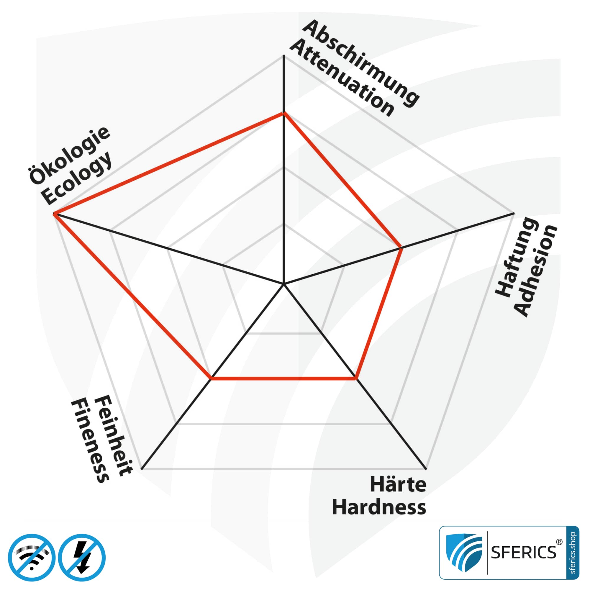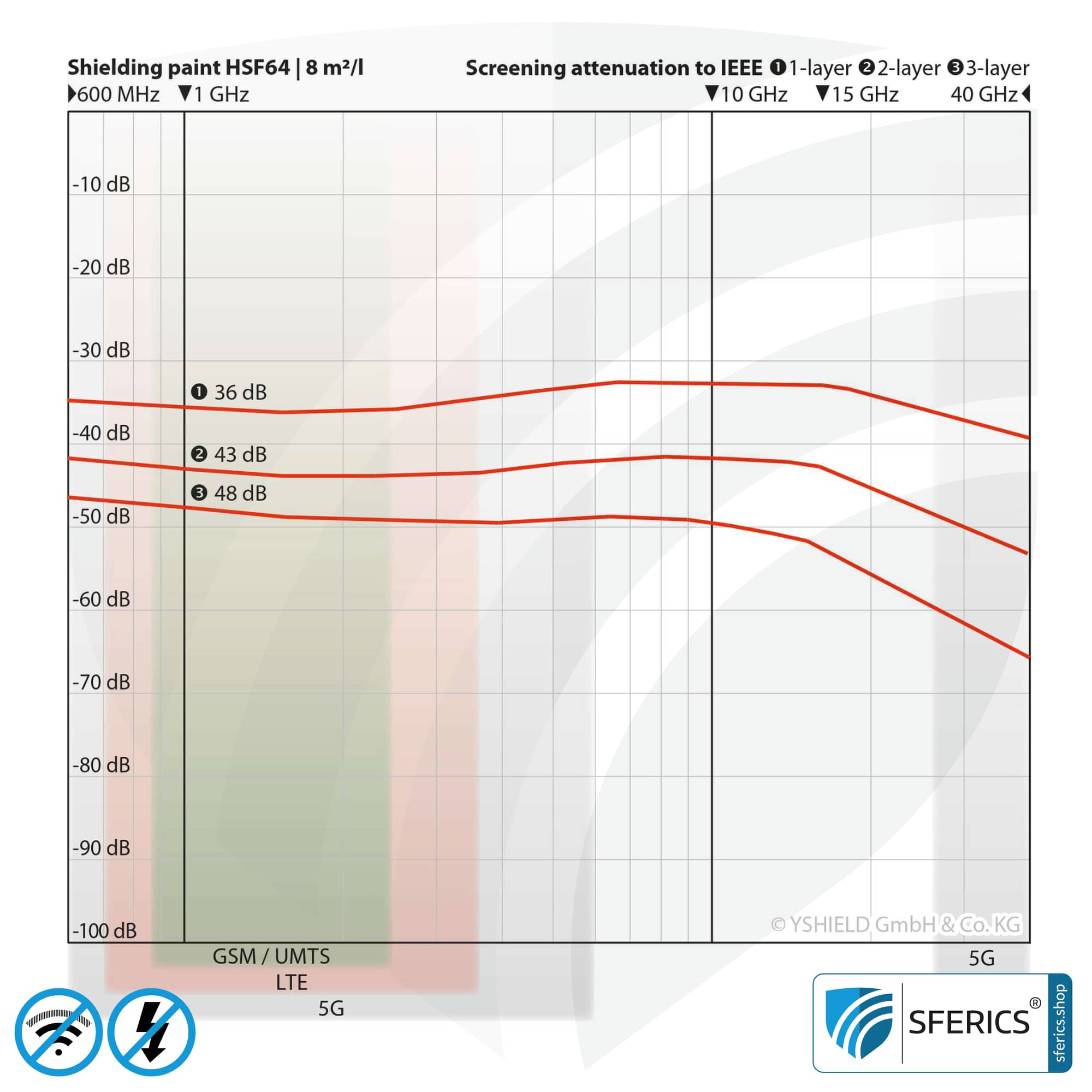Durch die minimalistische Rezeptur ist die Schirmleistung pro Anstrich geringer. Dies stellt im direkten Vergleich mit alternativen Abschirmfarben eine Schwächung dar. Aus diesem Grund ist bei der Abschirmfarbe HSF64 der dreifache Anstrich ausdrücklich empfohlen, 2-fach gilt als Minimum und Muss. Gerade bei modernen Funktechnologien wie zB. 5G ist eine hohe Schirmdämpfung ein zentrales Thema.