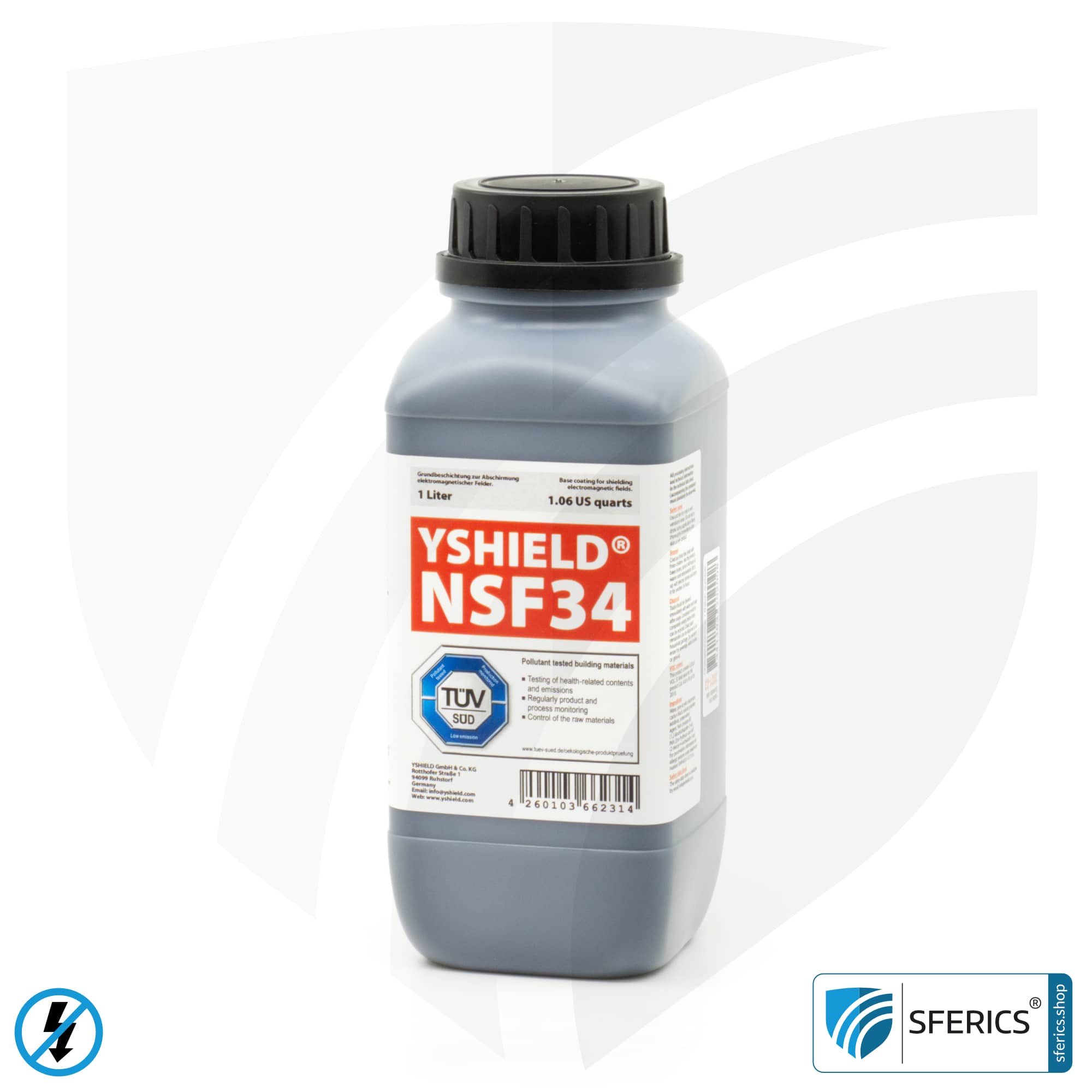 Die NSF34 Abschirmfarbe  wurde auf Basis eines hochwertigen Reinacrylatbindemittels entwickelt und bietet bereits einlagig aufgebracht bereits eine hohe Schirmdämpfung von bis zu 40 dB vor niederfrequenten elektrischen Feldern. Mit der Anwendung von NSF34 ist es durchaus möglich NF-Belastungen durch elektrische Felder von zB Hausstromleitungen vollständig zu schirmen. NSF34 ist frostbeständig und damit ideal für den ganzjährigen Versand. Weiter atmungsaktiv, lösemittelfrei, geruchsarm und emissionsarm.