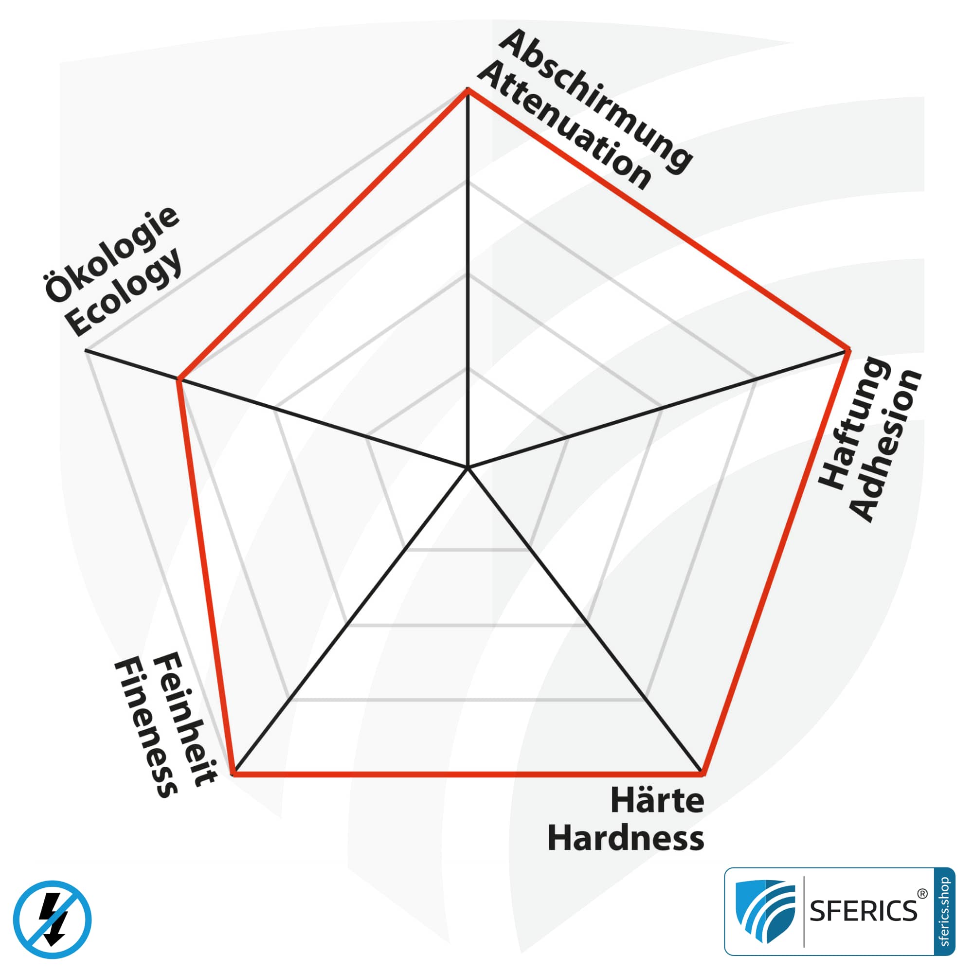 • Schirmdämpfung: Einlagig 80 dB Schutzwirkung vor niederfrequenten elektrischen Feldern (NF). Die Schirmdämpfung wird regelmäßig in im EMV-Labor gemessen. Es werden Messaufbauten nach folgenden Standards verwendet: ASTM D4935-10, IEEE Std 299-2006, IEEEE Std 1128-1998, ASTM A698/A698M-07.