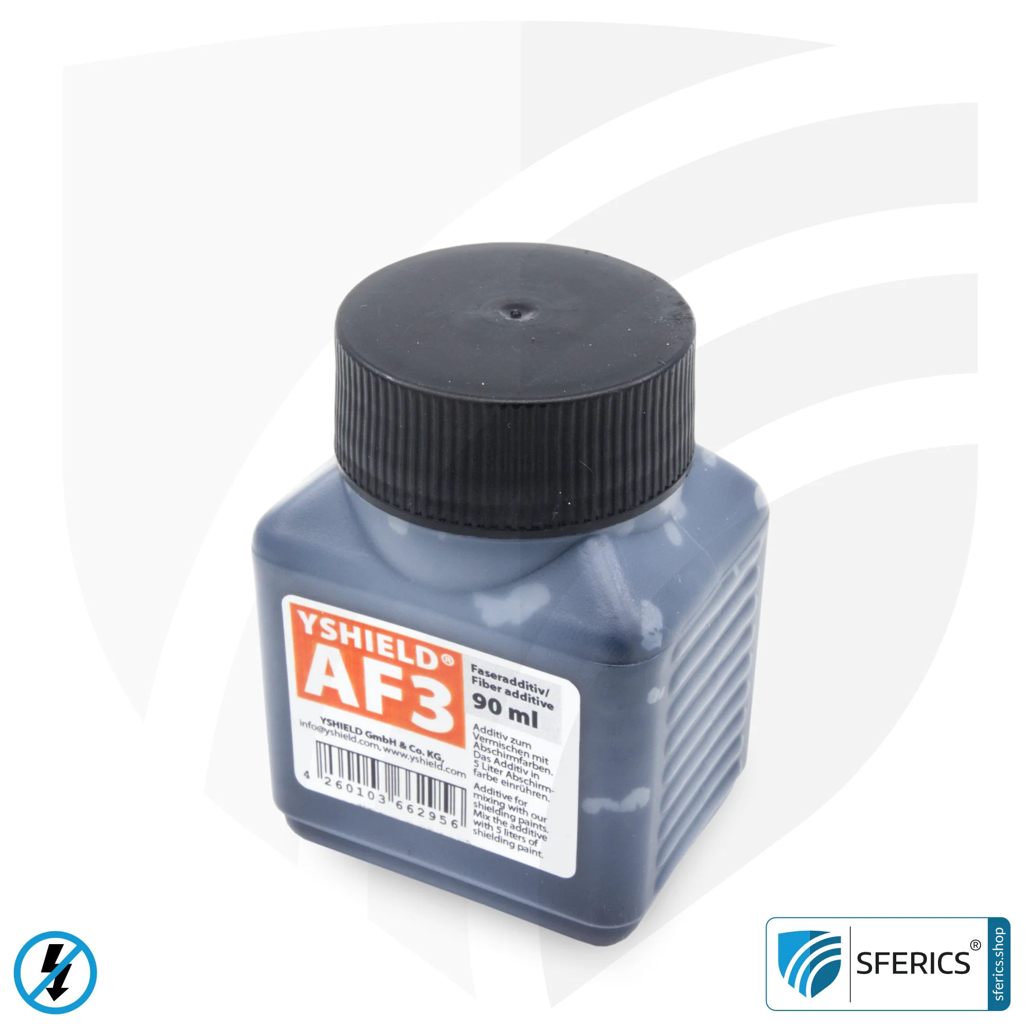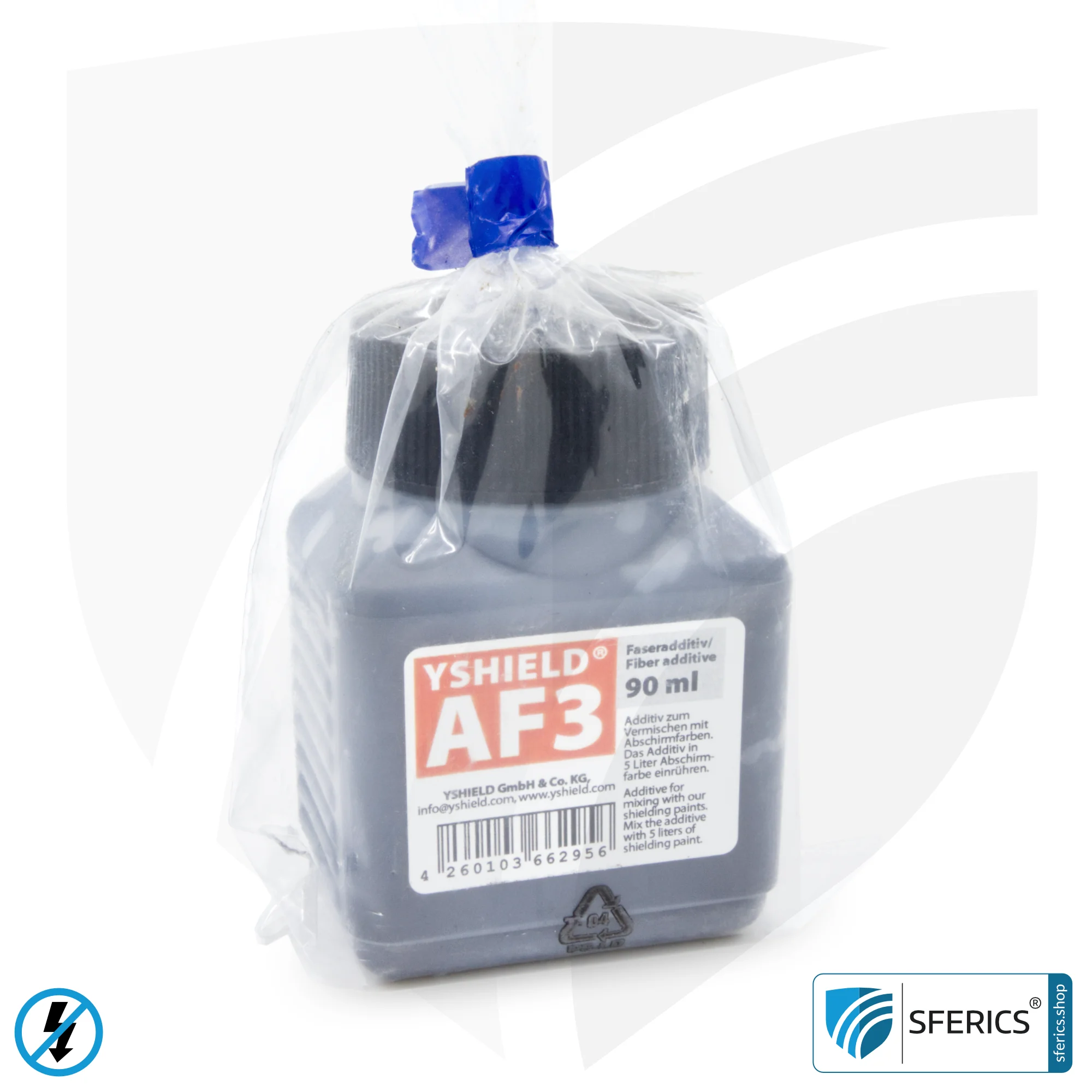 Das Additiv AF3 enthält 90 ml an langen, elektrisch leitfähigen Carbonfasern. Diese Menge von 90ml reicht für 5 Liter Abschirmfarbe und wird einfach eingerührt. Unbedingt einen Elektromischer verwenden und mindestens eine Minute lang rühren, damit sich alles homogen vermischt.