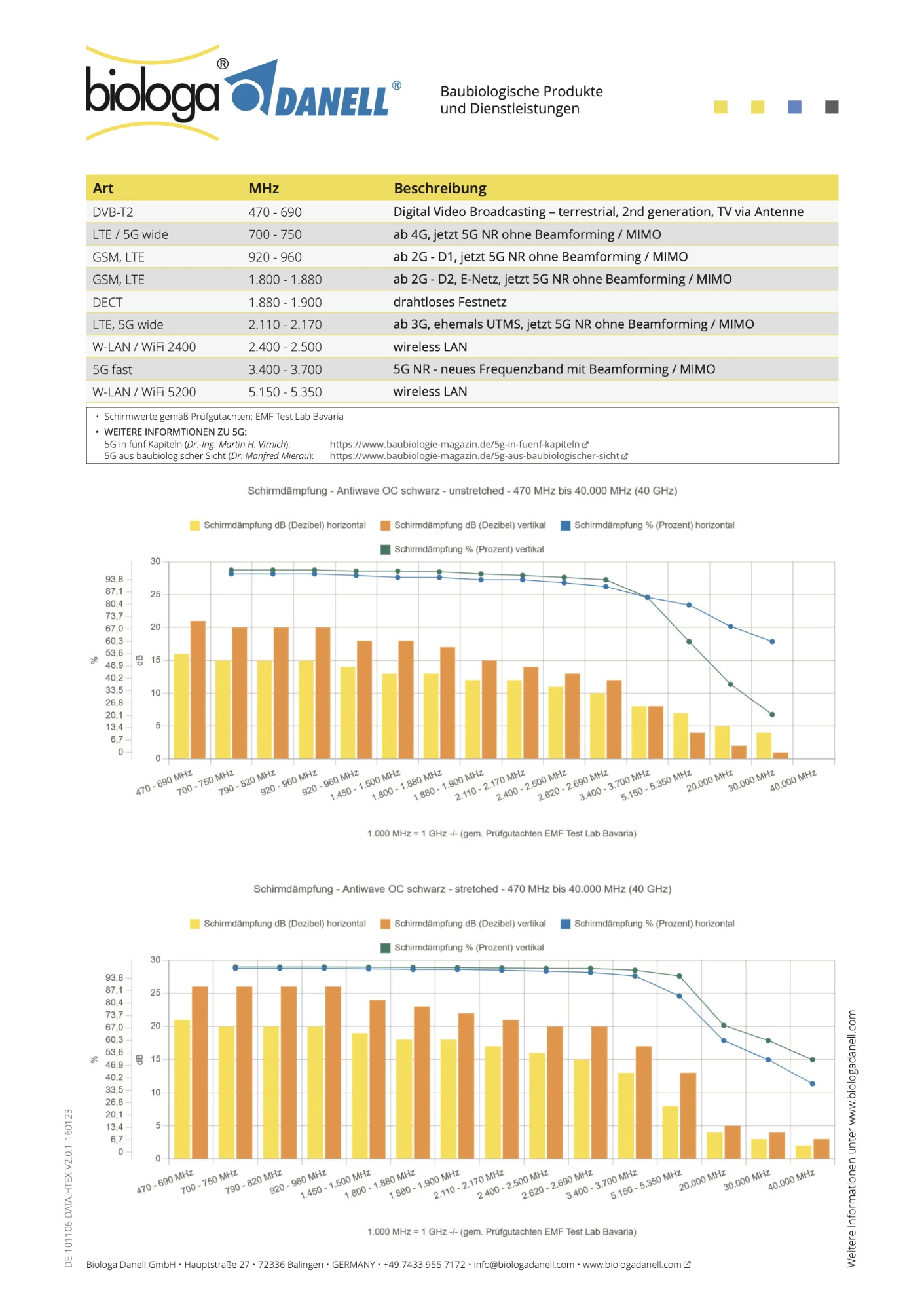 Durch den innovativen Aufbau der Stoffkonstruktion des Abschirmstoffs NEW ANTIWAVE und den Einsatz hochwertiger Materialien schützt dieses Tuch gegen elektromagnetische Strahlung im Bereich von 20 kHz bis 10 GHz mit einer Schirmdämpfung von über 99,9 Prozent. Dies bestätigt auch ein Gutachten von Prof. Pauli von der Universität der Bundeswehr in München.