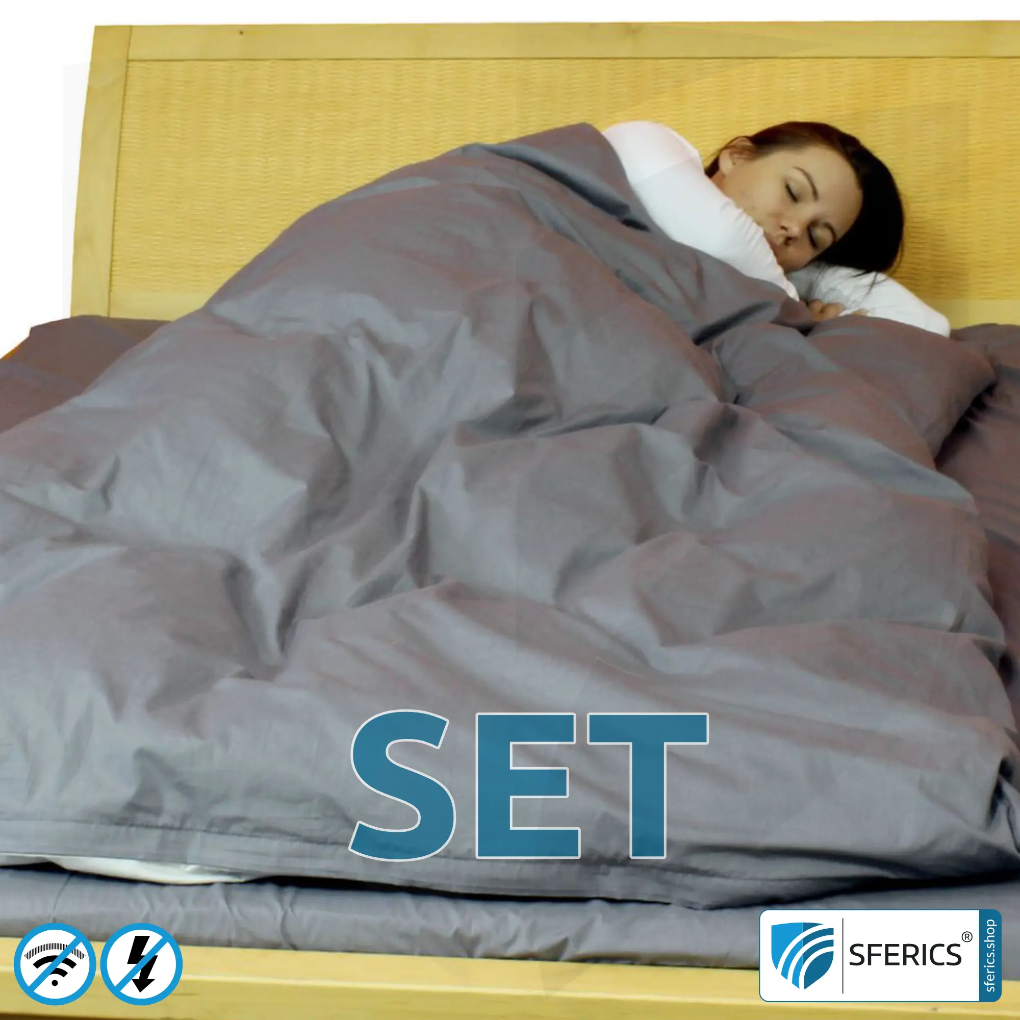 Abschirmende Bettwäsche im Set. Mobiler Schutz vor Elektrosmog für Erholung und Entspannung. Mobiler Schutz vor Elektrosmog, weltweit. Wirkungsvoll gegen LTE, 5G, WLAN, elektrische Wechselfelder NF, uvm.