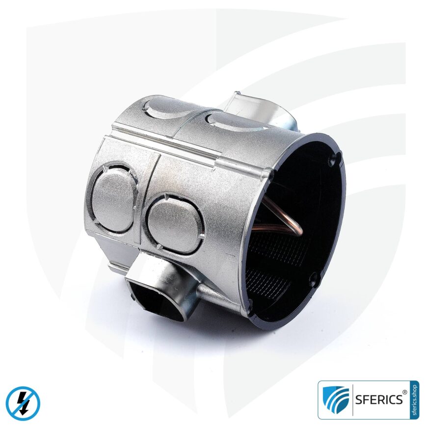 Diese geschirmte Installationsdose wird zur Reduktion niederfrequenter elektrischer Wechselfelder verwendet. Dies ist eine idealer Ergänzung zur mittels Abschirmfarbe geschirmten Wand um auch das “Loch Steckdose” im farradayschen Käfig bestmöglich zu schließen.