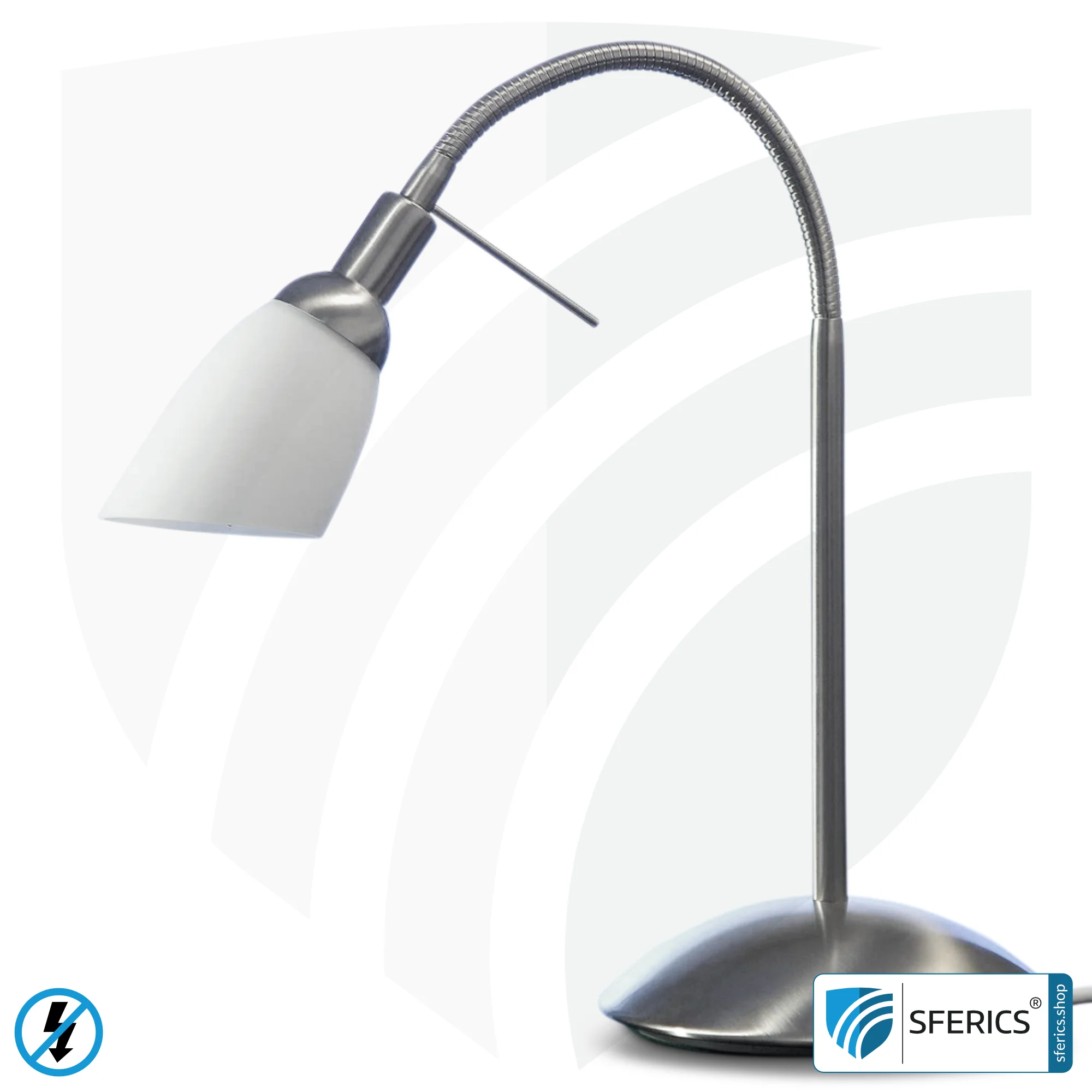 Flexibilität wird bei dieser Tischleuchte großgeschrieben. Der Fokus liegt natürlich in der Abschirmung gegen elektrische und magnetische Wechselfelder und dies wurde bei dieser Lichtdusche optisch sehr ansprechend integriert in eine Lampenkonstruktion aus gebürstetem Stahl. Der eingearbeitete flexible Metallschlauch im Leuchtenarm ermöglichst nahezu jede Leuchtenposition und schafft damit den je nach Anforderung idealen Lichtkegel.