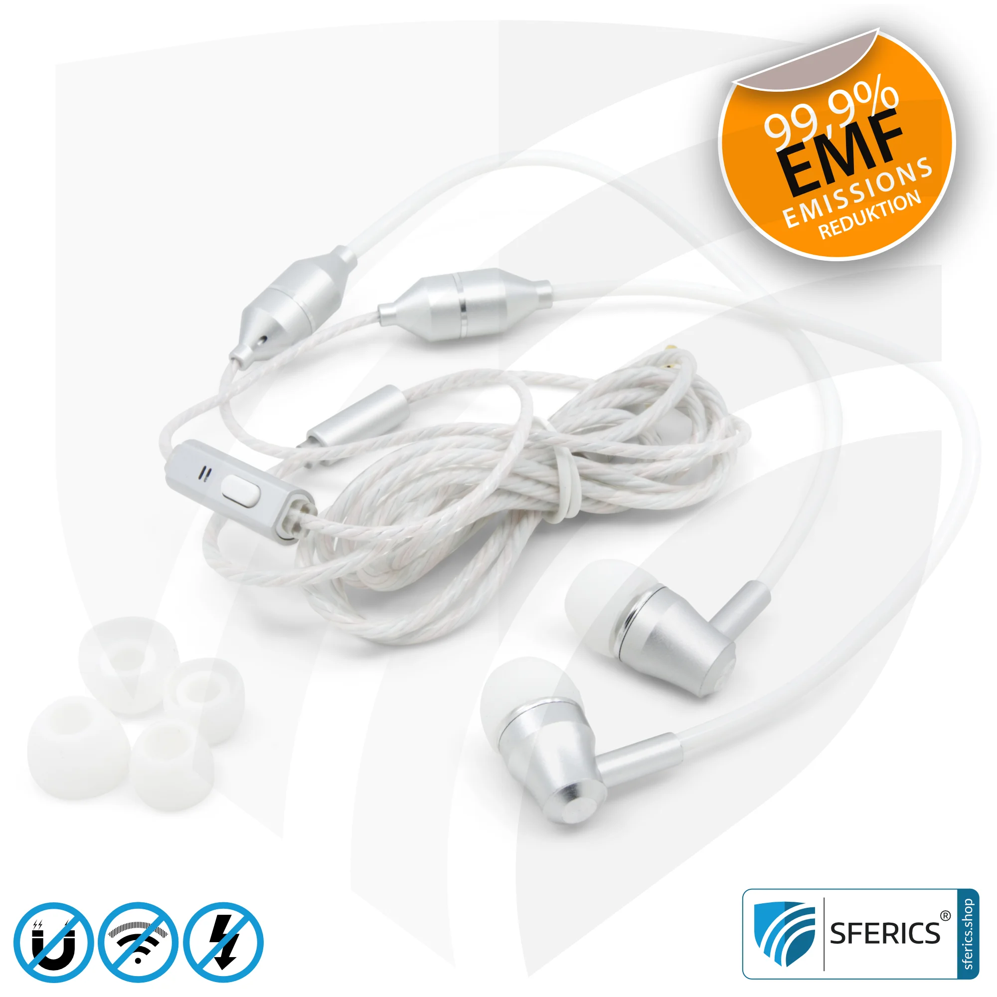 Strahlungsfreies SFERICS® In-Ear Stereo Headset mit Mikrofon und 3,5 mm Klinkenstecker. Elektrosmog freier Kopfhörer AirTube SMART in weiss-silber. Die Luftkabel Technologie sorgt für strahlungsarmes telefonieren und stressfreien Musikgenuss ohne Strahlung. Sage NEIN zu belastenden Magnetfeldern und Funkstrahlung (Bluetooth) am Ohr und in Kopfnähe!