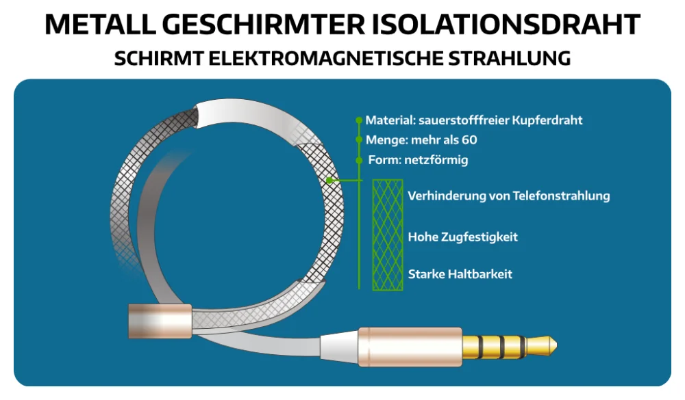 Dieser Teilbereich des Headsets würde mit einem Luftkabel nicht funktionieren, da die Weiterleitung elektrischer Impulse zur Steuerung und Schallwandlung notwendig ist. Um hier maximalen Schutz gegen externe Signale zu erreichen (Antennenwirkung), wurde das hochwertigen Kupferkabel mit einem Schutzmantelgeflecht umschlossen und geschirmt. Dadurch gelingt es induktive Ankopplungen und Leitungsstörme zu minimieren und die Übertragung hochfrequenter elektromagentischer Strahlung zu verhindern.