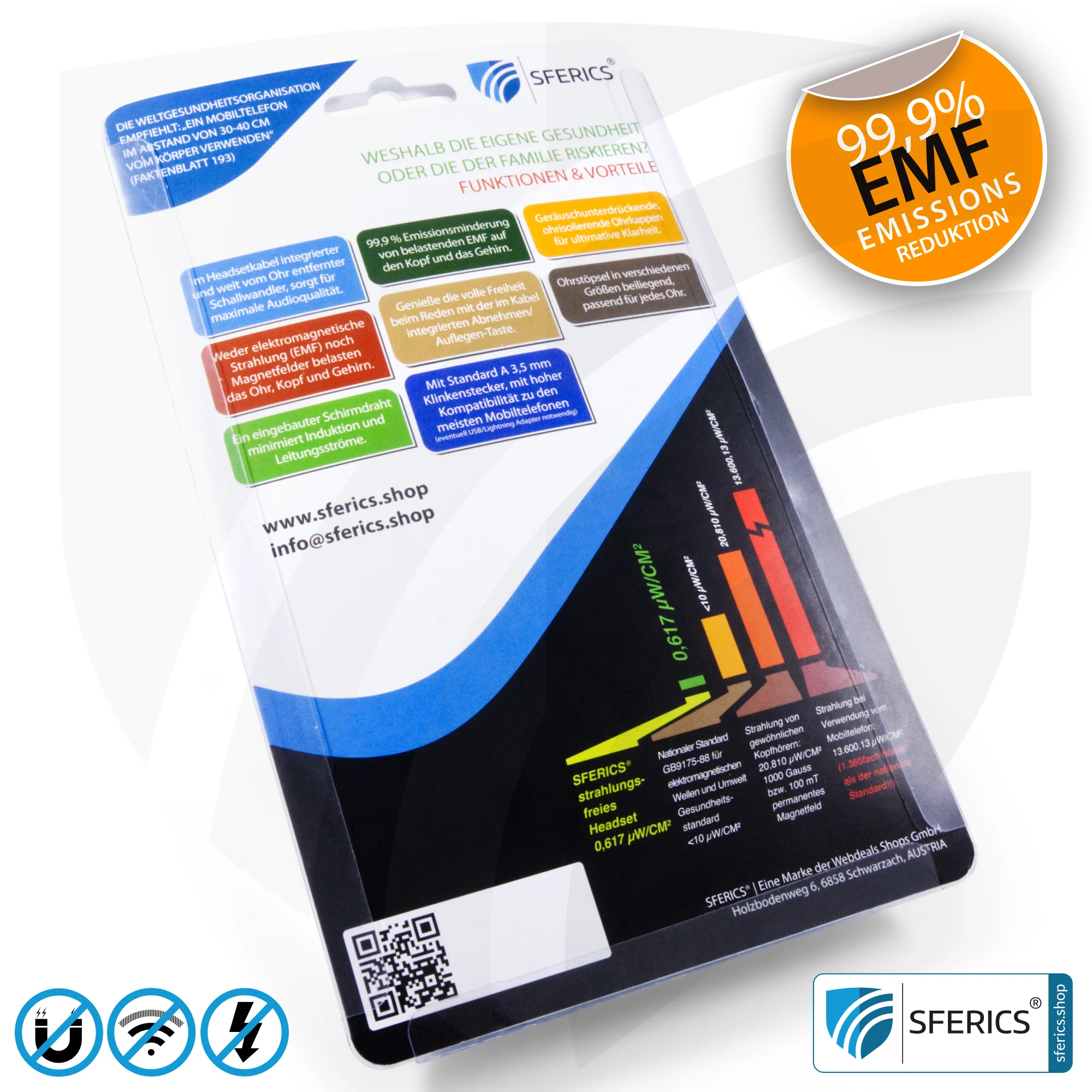 Durch das Luftkabel belasten weder elektromagnetische Strahlung (EMF) noch Magnetfelder das Ohr, Kopf und Gehirn! - 99,9 % Emissionsminderung auf Kopf und Gehirn