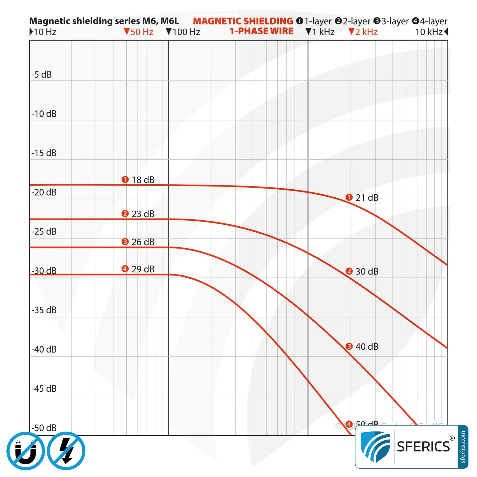 Physikalisch erzielen mehrere dünne Schichten eine deutlich höhere Schirmdämpfung als ein einzelnes massives Blech gleicher Dicke. Die Verbindung von 6 hauchdünnen Spezialfolien optimiert die magnetische Leitfähigkeit und somit das Schirm-Ergebnis.
