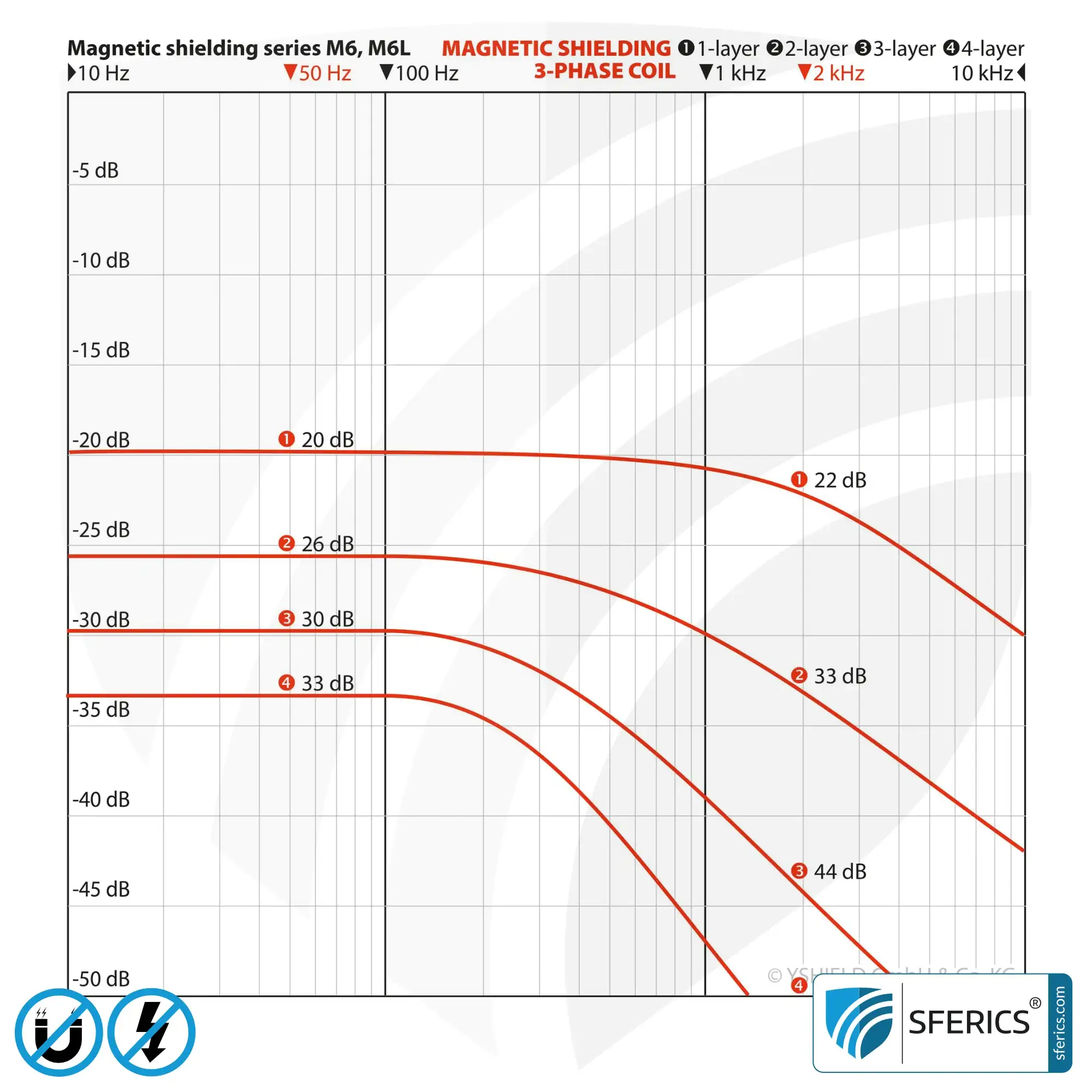 • Schirmung Magnetfeld (Statisch): DC-Verbraucher, Erdmagnetfeld, Permanentmagnet werden in einem Bereich von 15 % (einlagig) bis 58 % (vierlagig) abgeschirmt.