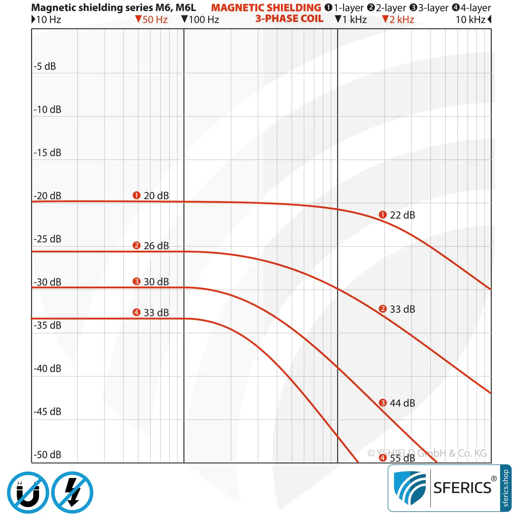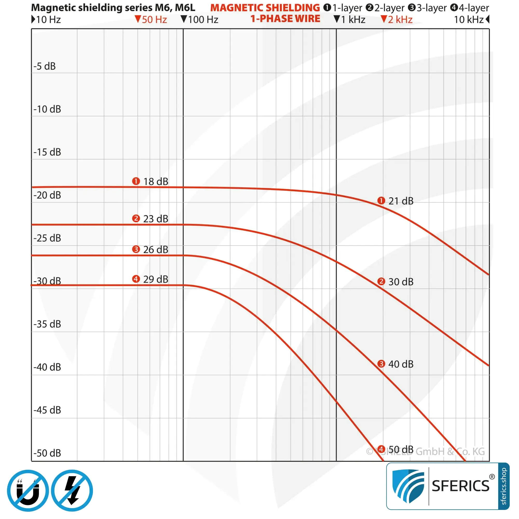 - Schirmung Magnetfeld (Statisch): DC-Verbraucher, Erdmagnetfeld, Permanentmagnet werden in einem Bereich von 15 % (einlagig) bis 58 % (vierlagig) abgeschirmt.
