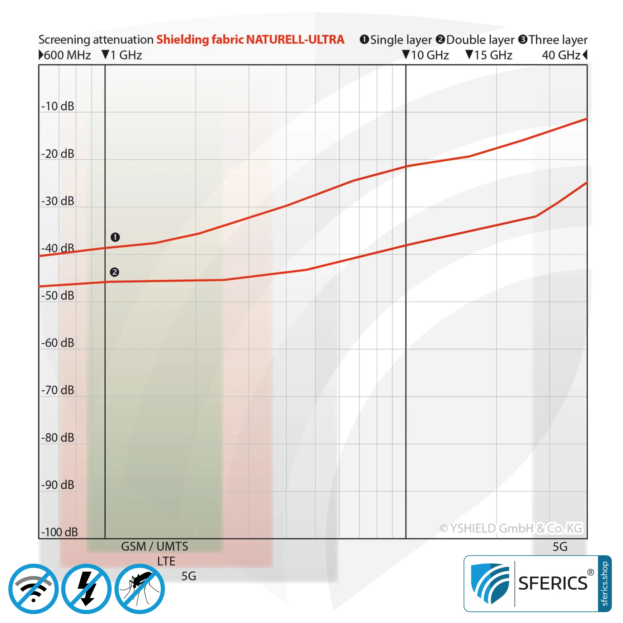 Der NATURELL ULTRA Abschirmstoff besteht aus einem speziellen Baumwollgewebe und wurde mit dem OEKO-TEX® STANDARD 100 Label ausgezeichnet. Dieses patentierte Hightech-Garn besteht aus 81 % Baumwolle, 17 % Kupfer, 1 % Silber, 1 % Carbon und schafft damit eine effektive Schirmdämpfungswerte von bis zu 38 dB.