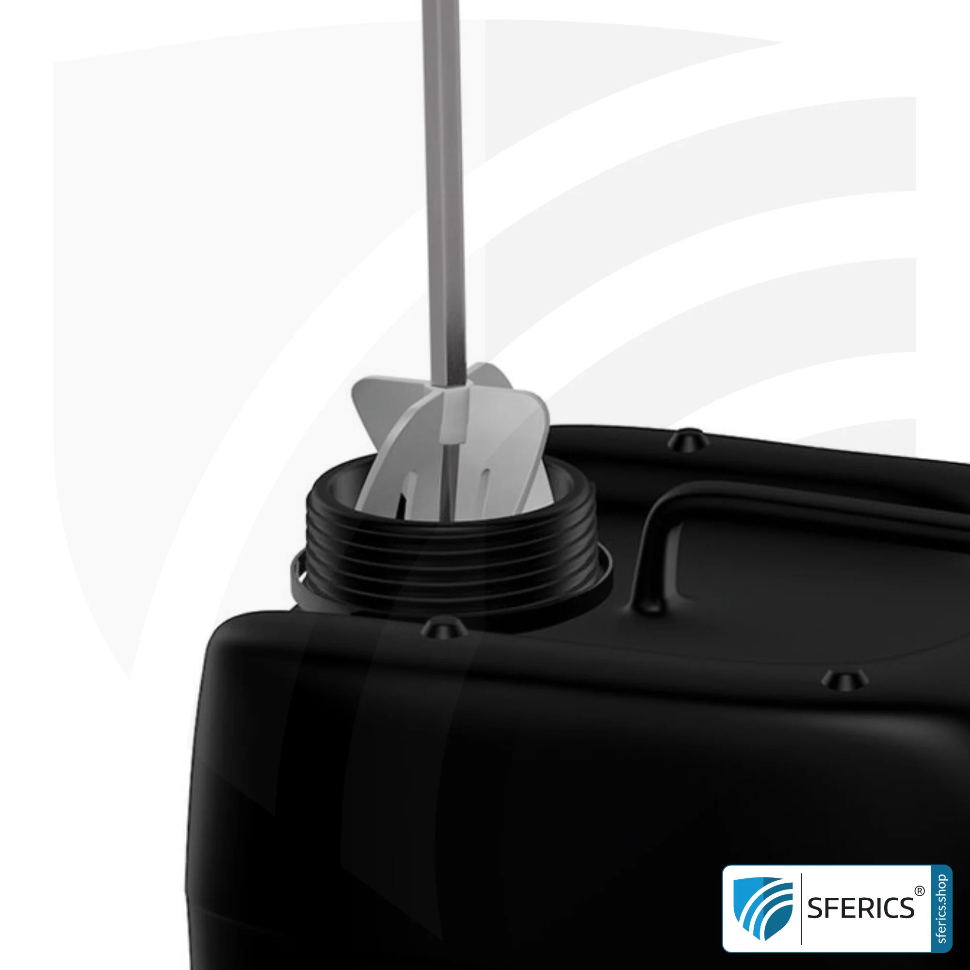Die Anwendung könnte nicht einfacher sein. Befestige einfach den Farbrührer an einer Bohrmaschine oder einem Akkuschrauber und rühre die Abschirmfarbe direkt im originalen Farbbehälter auf. Bei einem 1-Liter Behälter empfehlen wir eine Rührdauer von 1-2 Minuten, bei einem 5-Liter Behälter eine Rührdauer zwischen 3 und 5 Minuten. Bewege den Stab während des Rührens auf und ab sowie kreisförmig. Sobald die Abschirmfarbe aufgerührt ist, wende sie gleich an. Bei längeren Standzeiten (einige Stunden) oder bei erneuter Anwendung am nächsten Tag, rühre die Farbe bitte erneut kurz auf.