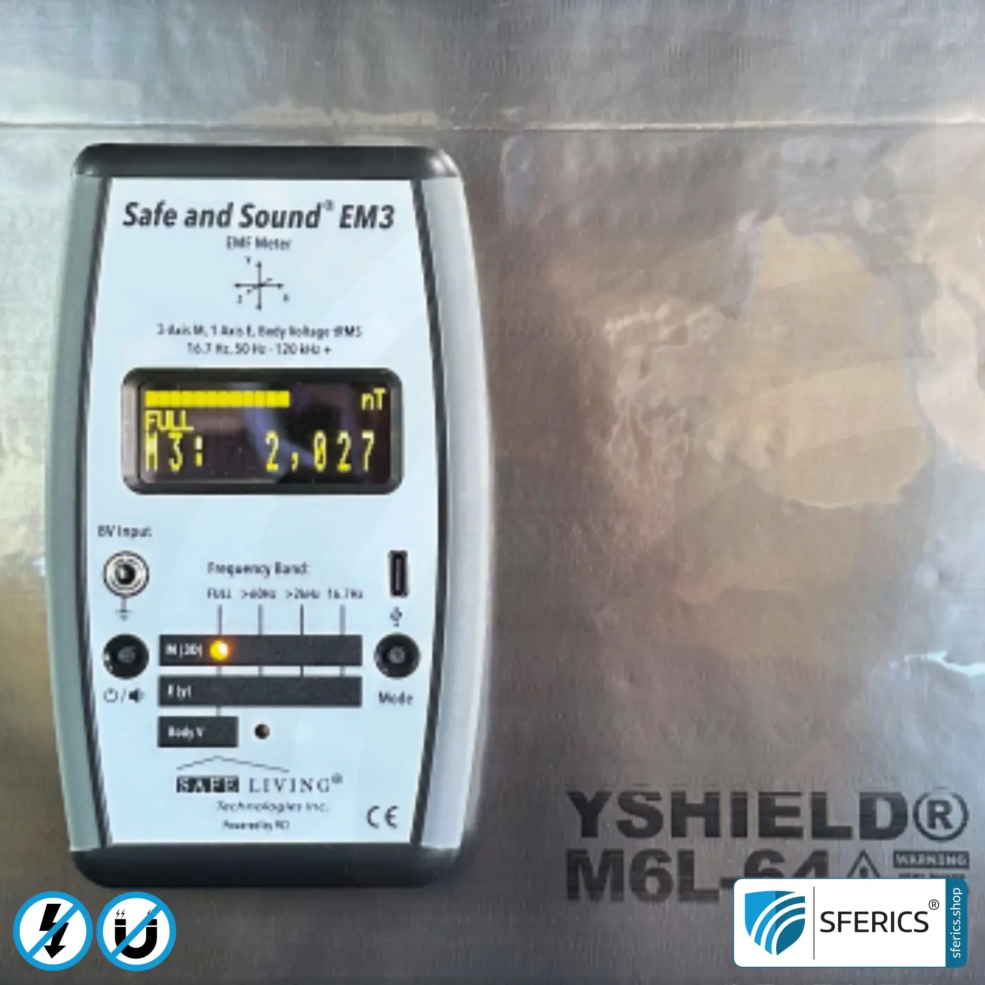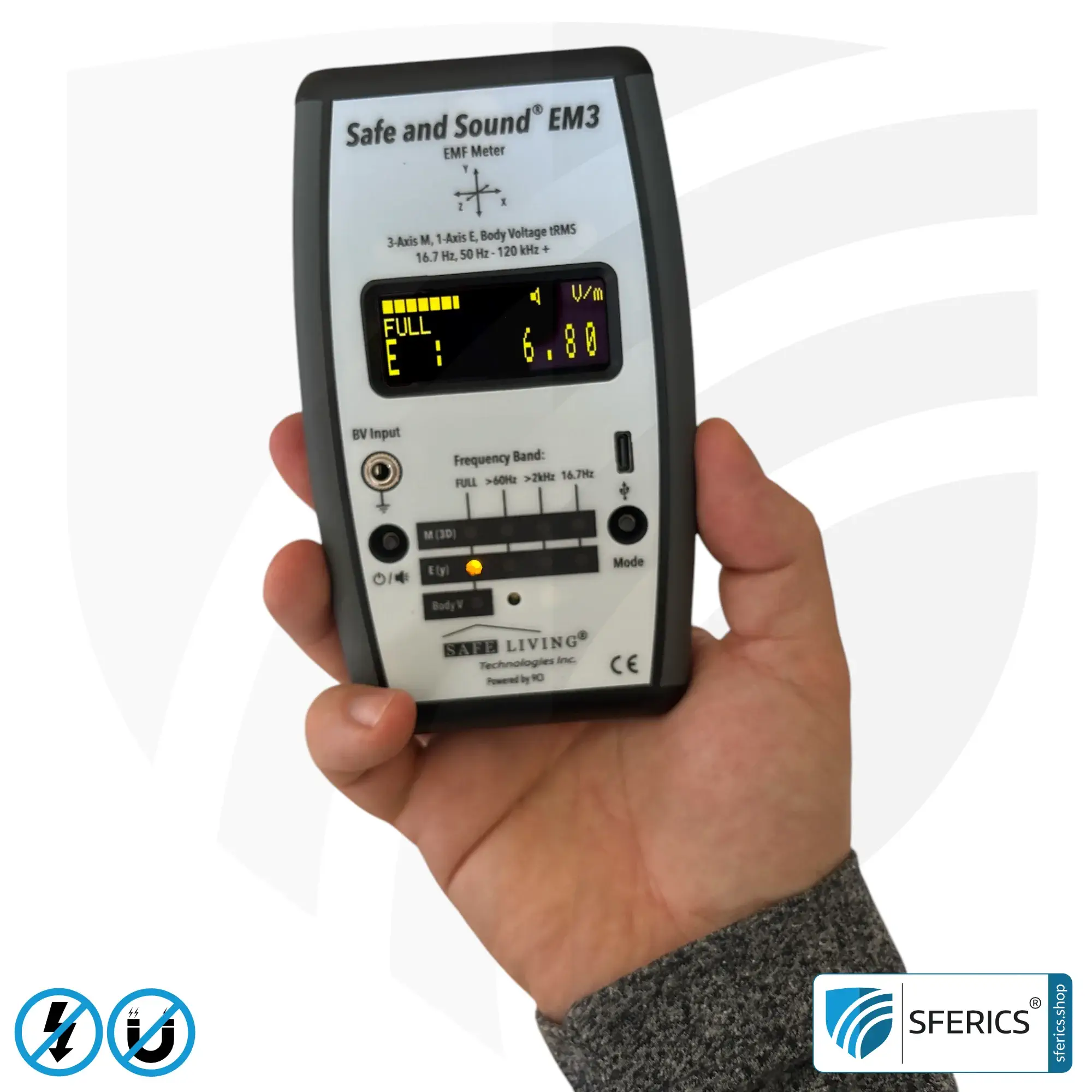 SAFE AND SOUND EM3 ist ein 3-in-1 EMF Messgerät für den niederfrequenten Bereich (z.b. Stromleitungen im Haus, Haushaltsgeräte, Hochspannungsleitungen, Bahnanlagen, usw.). Dieser Detektor überrascht mit Präzision und ist perfekt für den Einsteiger der MEHR will.
