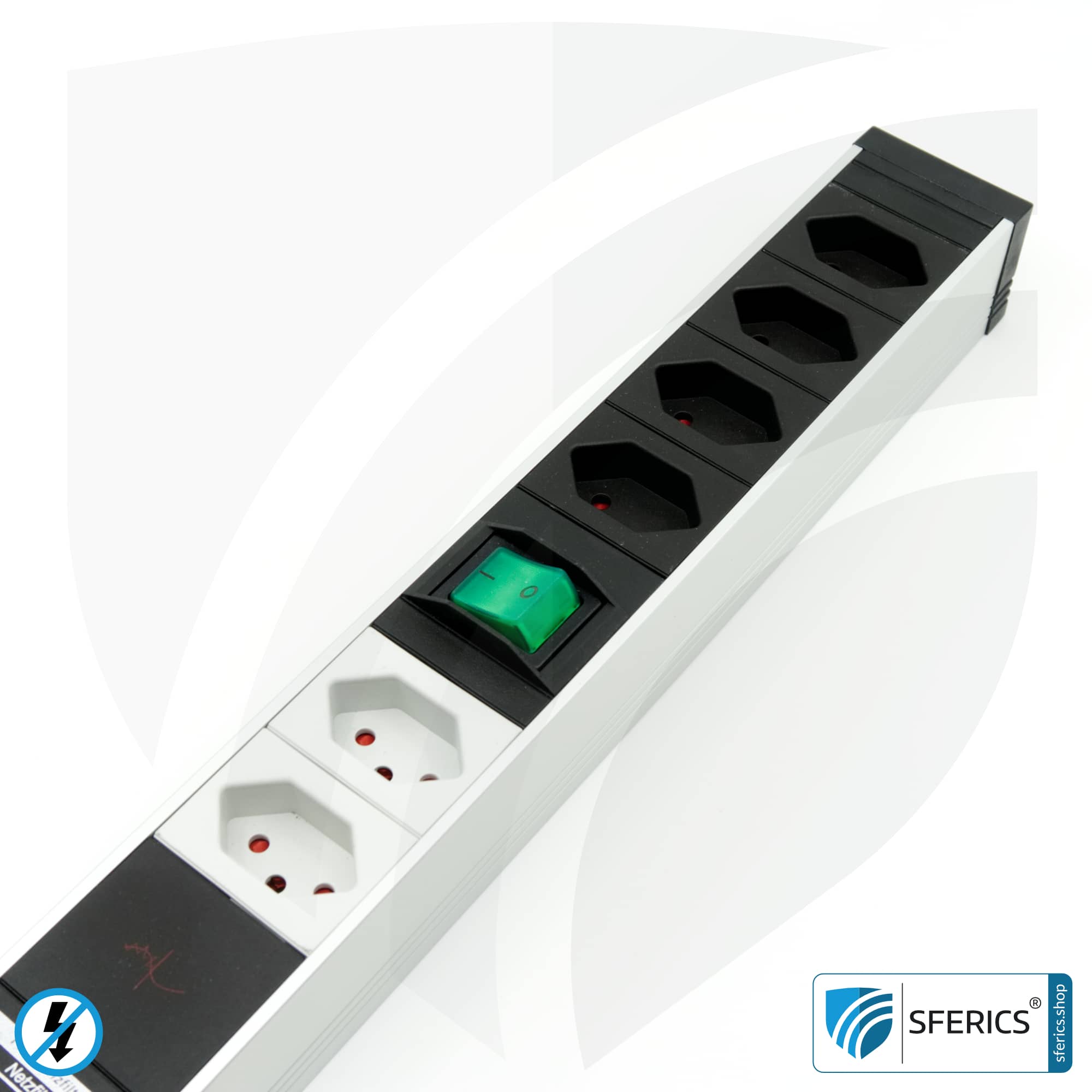4 Typ J Einsätze geschaltet mit zweipoliger Abschaltung und 2 Einsätze ungeschaltet für Dauerstromverbrauch. Hohe Schirmung gegen elektrisches Wechselfeld bei Netzspannung. Hervorragende Erdungsverkabelung innerhalb der Steckdosenleiste. Das aufregende PLUS bei dieser 6-fach PC Steckdosenleiste ist jedoch der auf alle Schukoeinsätze verteilte PRO-TECTOR Überspannungsschutz sowie das leistungsfähige Vollschutz HF Filtersystem mit 50 dBm und einem Wirkungsbereich bis 80 MHz.
