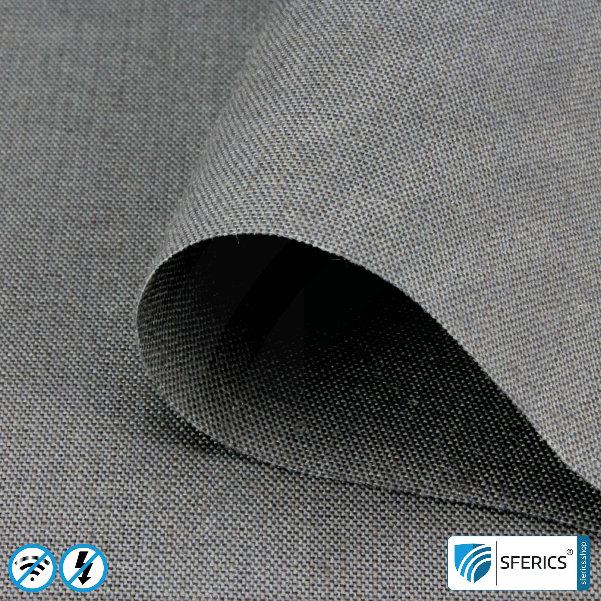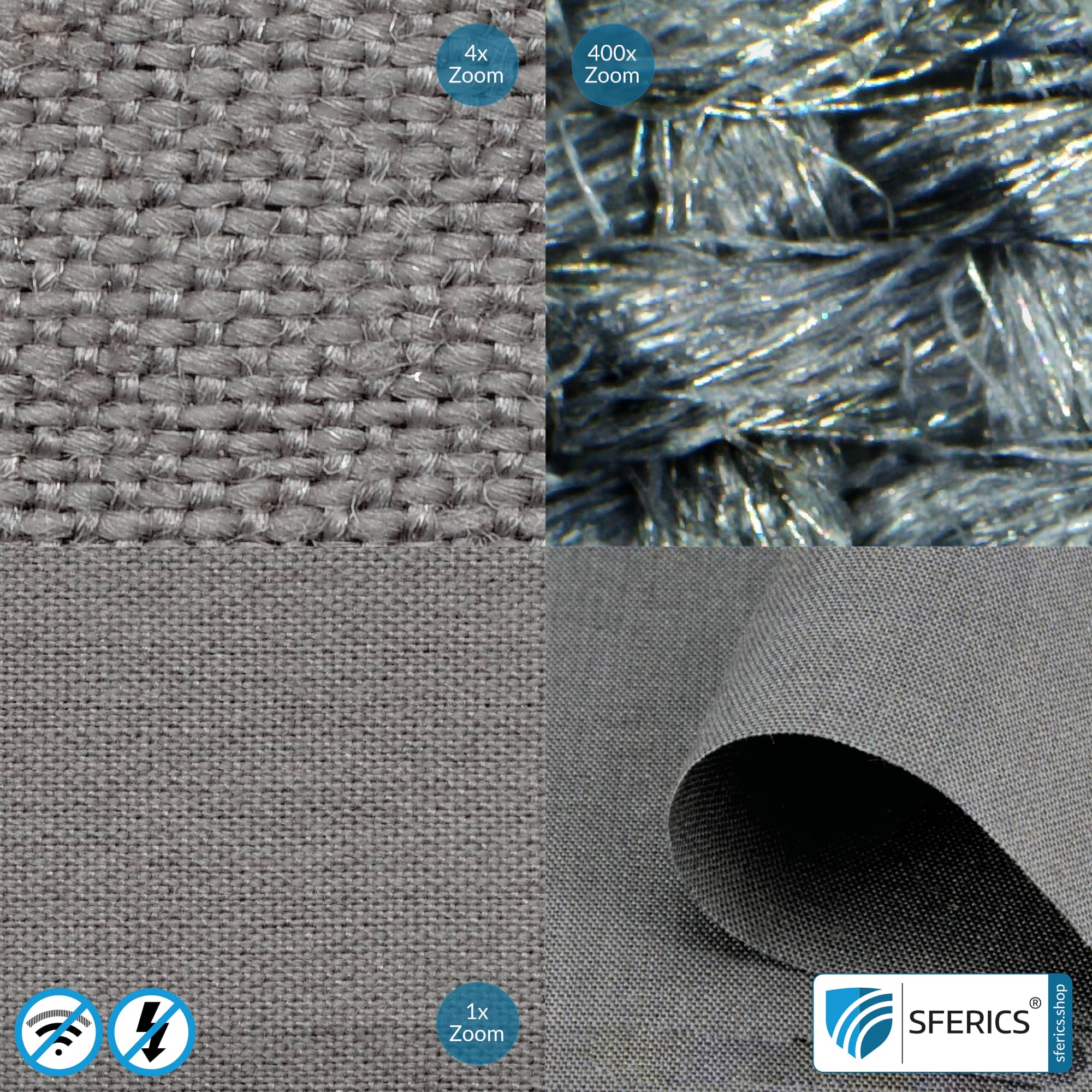 STEEL GRAY Abschirmstoff gegen Elektrosmog. HF Abschirmung bis 41 dB, erdbar. Ideal für blickdichte Vorhänge und Textilprodukte wie zB. Bettwaren und Decken. Erdbar NF. Wirkungsgrad Abschirmung 99,99% – wirkungsvoll gegen 5G!