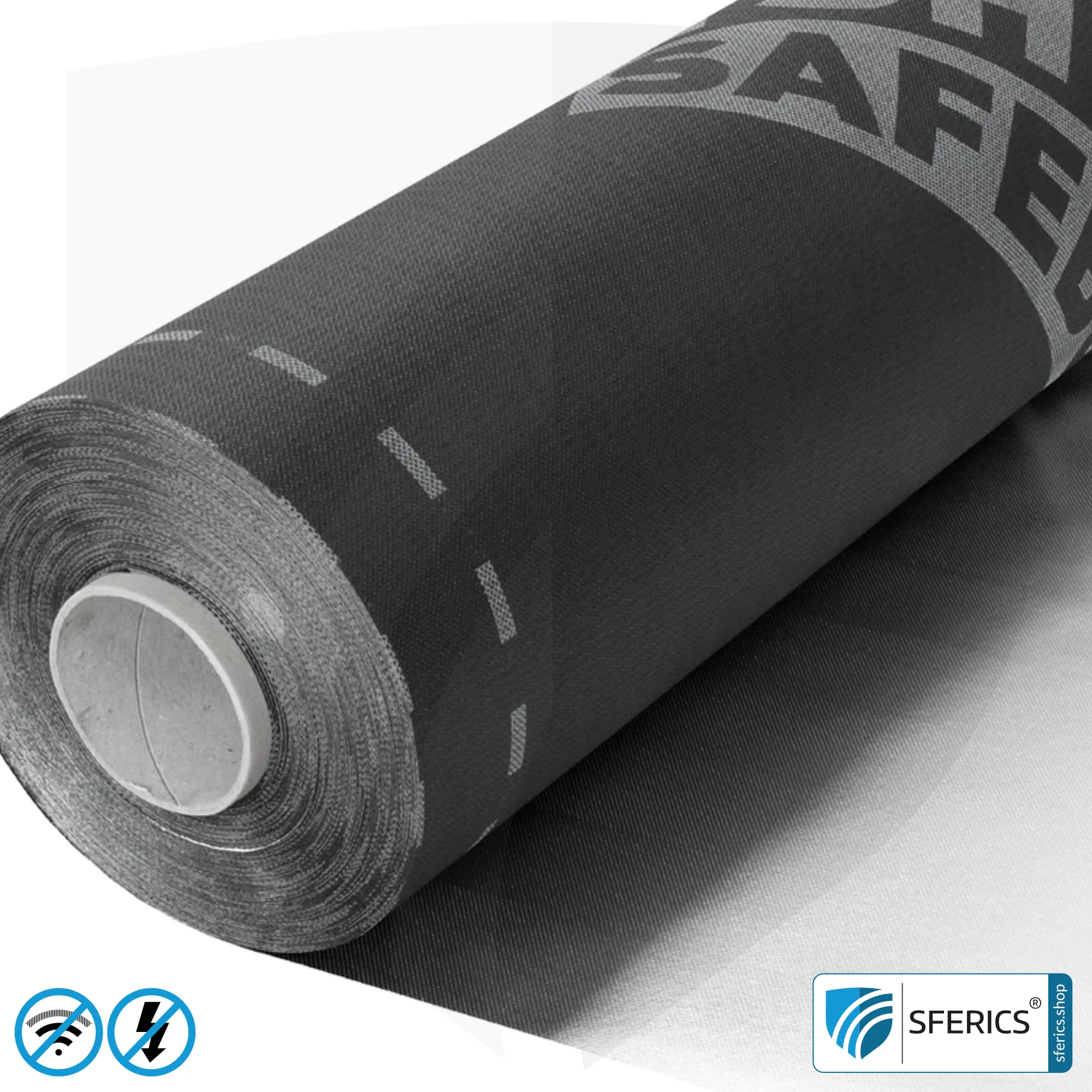 Abschirmende Unterspannbahn SAFEBUILD® U230 für die Anwendung im Aussenbereich und Innenbereich für Dach, Fassade und Trockenbau. Diese Unterspannbahn gegen Elektrosmog HF + NF zählt zu unseren höchstschirmenden Produkte aus dem Profibereich. Wirkungsgrad Abschirmung über 99,999999999 % (111 dB). Breite 90 cm. Wirkungsvoll gegen 5G!