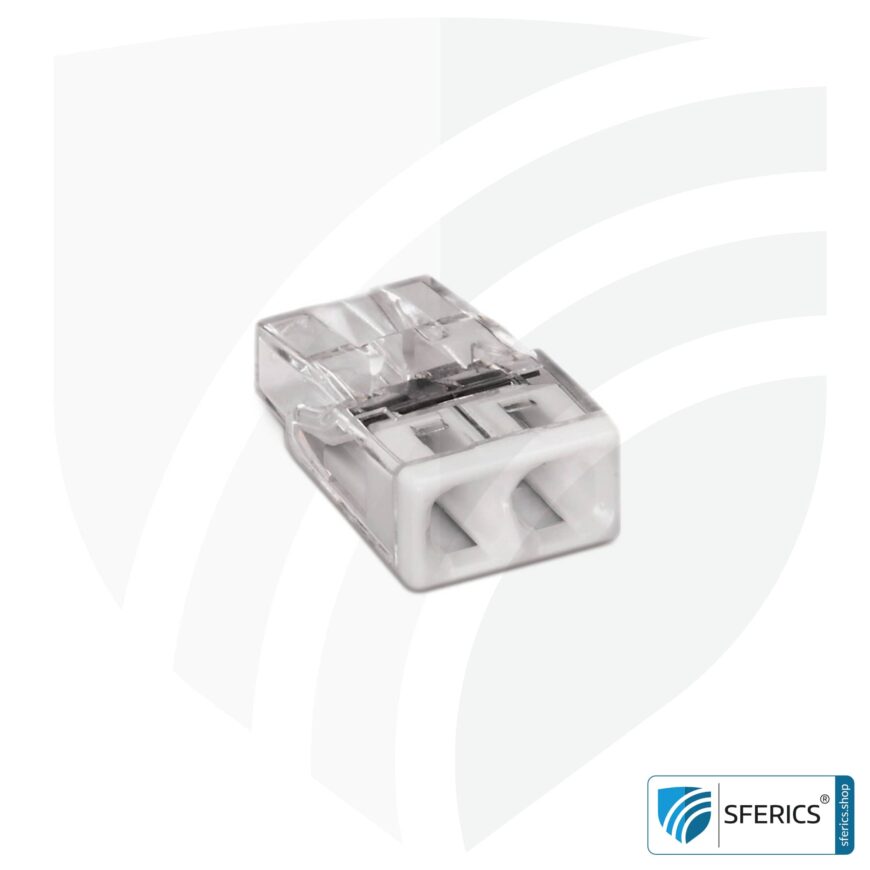 WAGO Compact Steckklemmen bzw. Verbindungsdosenklemme Modell 2273-202, für bis zu 2 eindrähtige Leiter. Geeignet zur Verbindung vom Beidraht der geschirmten Elektroleitung mit der geschirmten Unterputzdose bzw. Hohlwanddose.