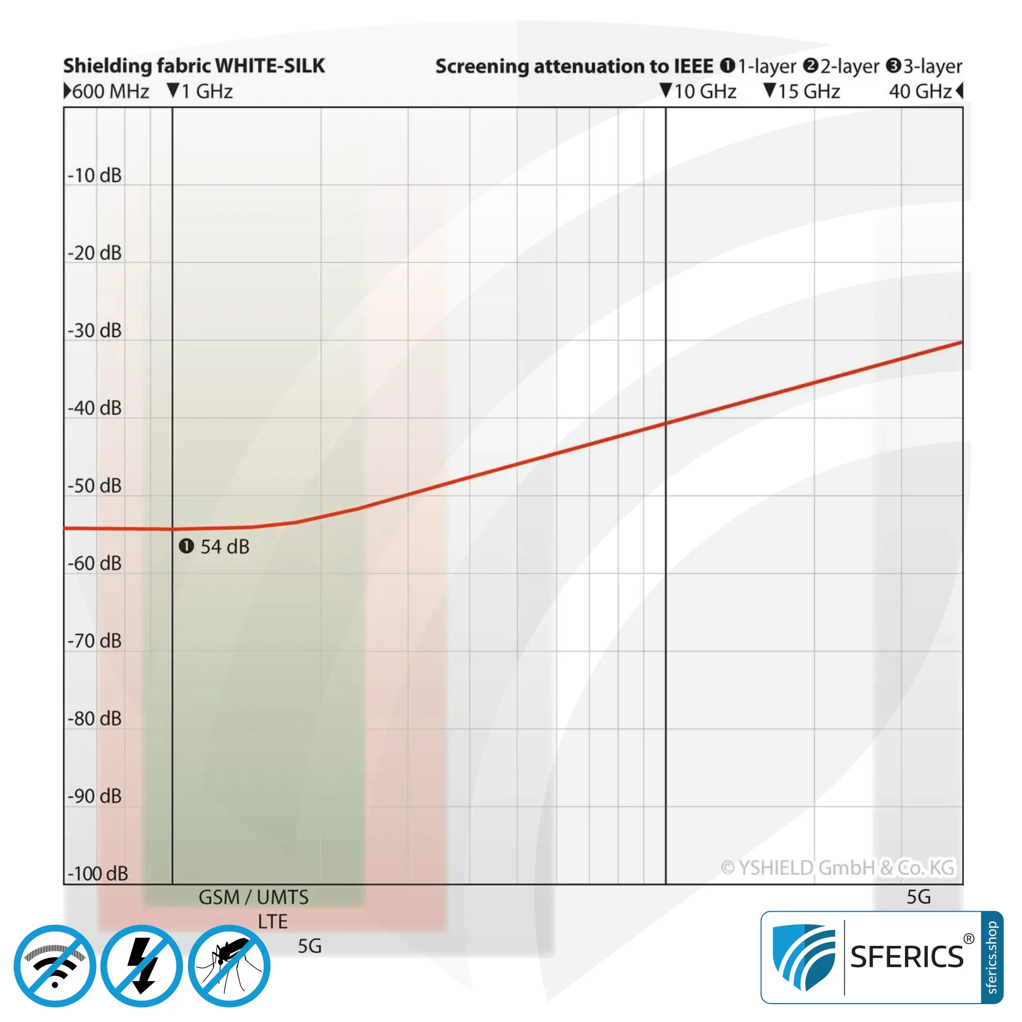- Mit 54 dB die höchste Schirmdämpfung die wir jemals bei einem weissen Abschirmstoff hatten
